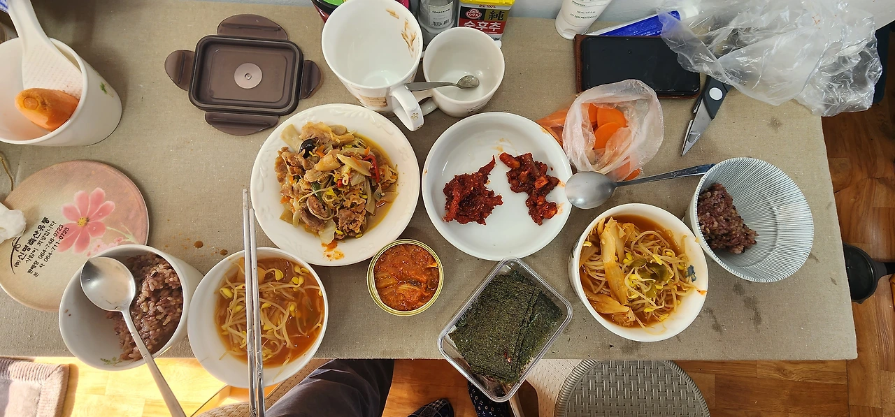 오늘부터 냉장고에 쟁여둔 음식 파먹기를 시작한다. 첫 음식은 냉동고에 있는 고추장 양념 돼지고기. 양파 넣고, 당근 넣고, 대파 넣고 볶아 야채 가득 돼지불고기를 만들었다. 후배가 보내준 낙지젓갈과 명태식혜를 반찬으로 꺼내고, 김치콩나물국을 끓여 식탁을 차렸다.