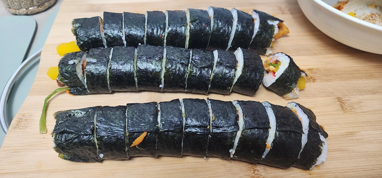 아침에 일어나 아내가 만들어둔 음식들을 파먹기 시작한다. 냉장고에는 김밥재료와 야채돼지불고기와 카레가 남아있다. 아내 음식 파먹기로 이번 주는 지낼 듯하다. 새로 밥을 지어 남은 김밥 재료를 소진했다. 짜잔! 김밥 세 줄이 완성됐다. 한 줄은 아침식사로, 두 줄은 점심도시락으로!