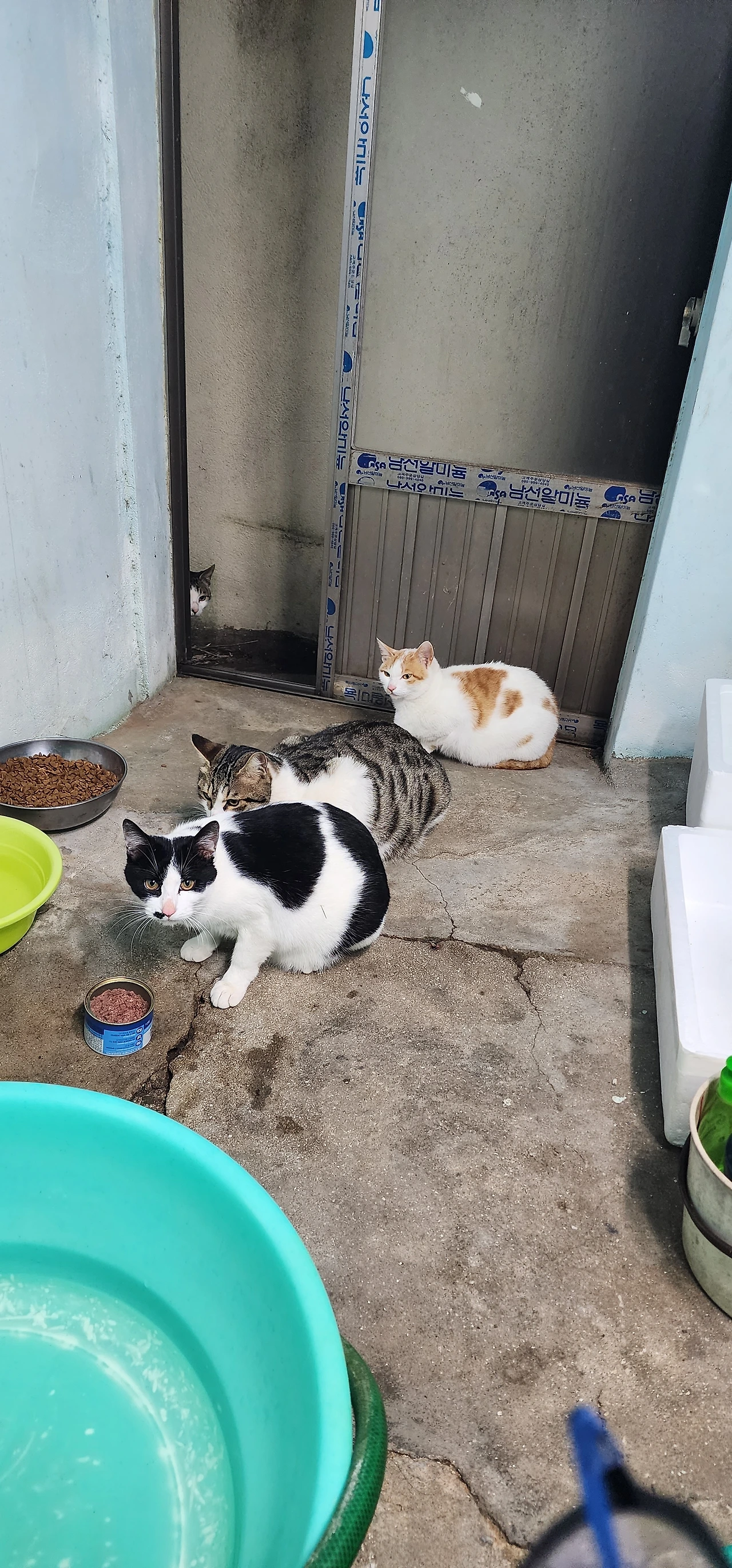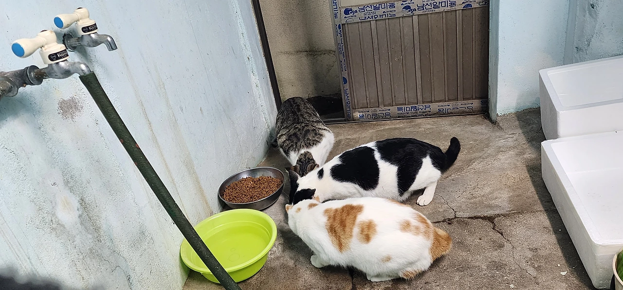 벽 쪽으로 스티로폼 상자를 놓아두고, 젖지 않은 사료와 깨끗한 물을 새로 마련했다. 그리고 추위로 고생했을 냥이를 위로하는 마음으로 처음으로 고양이캔을 깠다. 캔을 까자마자 냄새를 맡고 감자(노랑), 가지(회색), 우유(검정)가 보일러실로 들어왔다. 캔을 까니 건식사료는 아랑곳하지 않고 캔으로 달려들어 경쟁하듯 으르렁대며 습식 사료를 먹는다.
