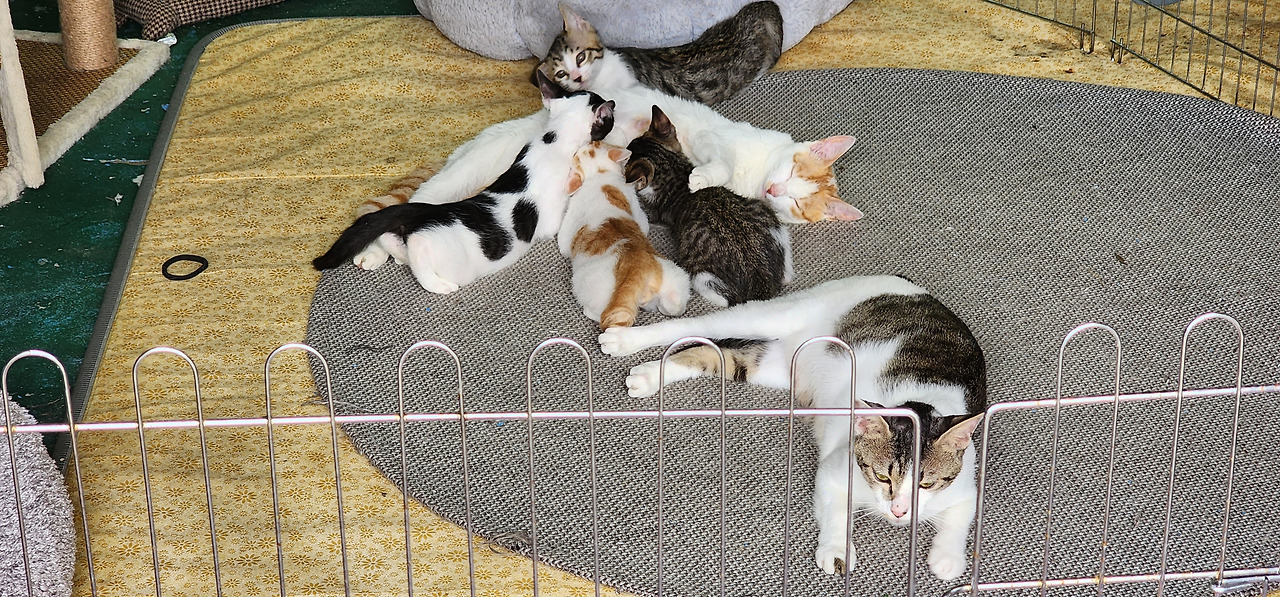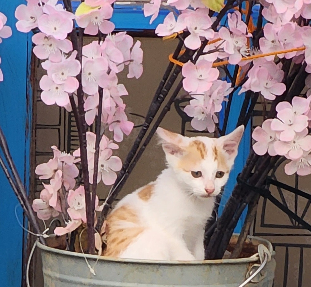 꽃과 놀고 있는 새끼 고양이 놀자(왼쪽) 고양이 가족 단체 사진(사진 속 맨 앞 꼬리 잘린 고양이가 어미 고양이 비비자)