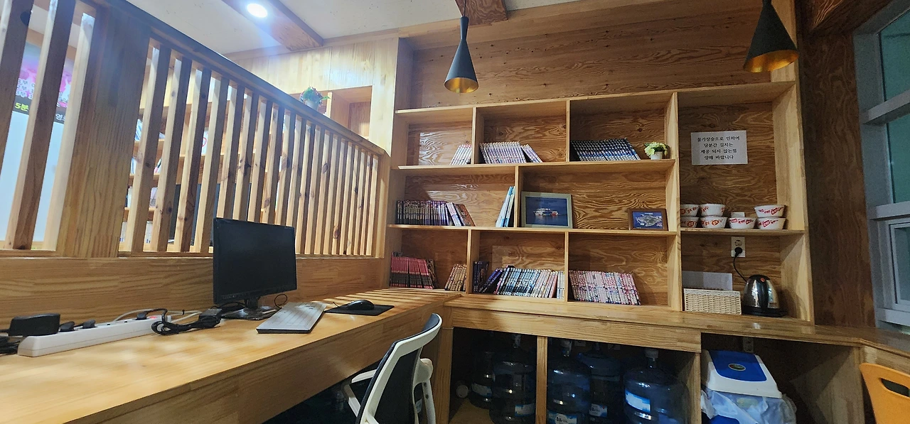 핸드폰을 받아 들고 다시 매표소에 오니 운진항 매표소 직원이 선사 2층에 숙직실은 아니고 휴게실이 있는데, 이불은 없지만 바닥이 보일러가 되어 따뜻하니 거기서 하루 지내는 게 어떻겠냐고 친절을 베푼다. Why not!(선사에 그런 공간도 있었던가?) 단체 버스를 타고 관광 오면 관광버스 기사님들이 쉬는 곳이란다. 커피도 있고, 만화도 있고, 컵라면도 있고, TV도 있고, 심지어 인터넷이 되는 컴퓨터도 있는 공간이다. 샤워실과 이불만 없다 뿐이지 호텔보다 편의시설을 잘 갖춘 곳이다. 3만 원은 굳고, 숙소가 정해졌으니 이제 걱정은 해결되었다.