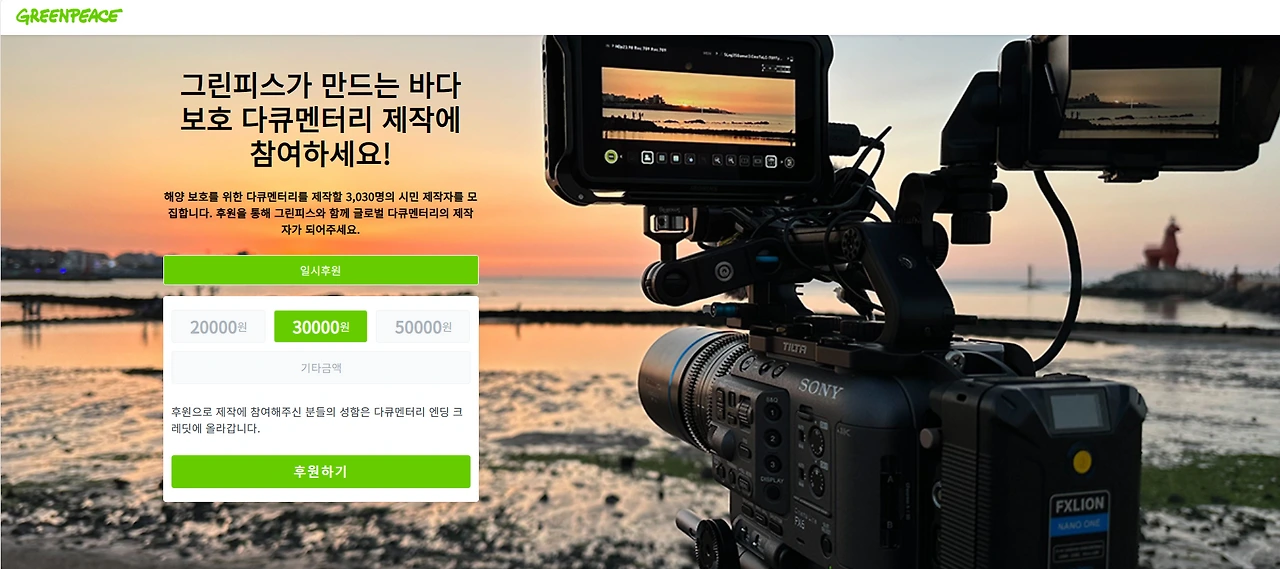 해양보호를 위해 50년간 바다를 지켜온 그린피스가 다큐멘터리 제작에 나섭니다. 이 다큐멘터리는 우리의 곁을 감싸고 있는 ‘바다'에 대한 이야기입니다. 사람부터 동물까지, 바다 주변에는 많은 생명이 숨 쉬고 있습니다. 하지만 바다는 점점 푸른빛을 잃어가고 있습니다. 이를 증언하는 7명의 특별한 시선을 기록하고, 바다를 되살릴 방법을 알리고자 이 다큐멘터리를 제작합니다. 바닷속 생명의 파도가 멈추지 않고 넘실대길 바라며, 다큐멘터리의 제작자 3,030명을 모집합니다.