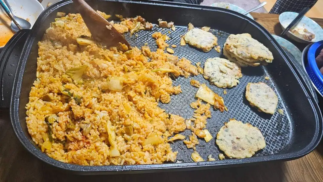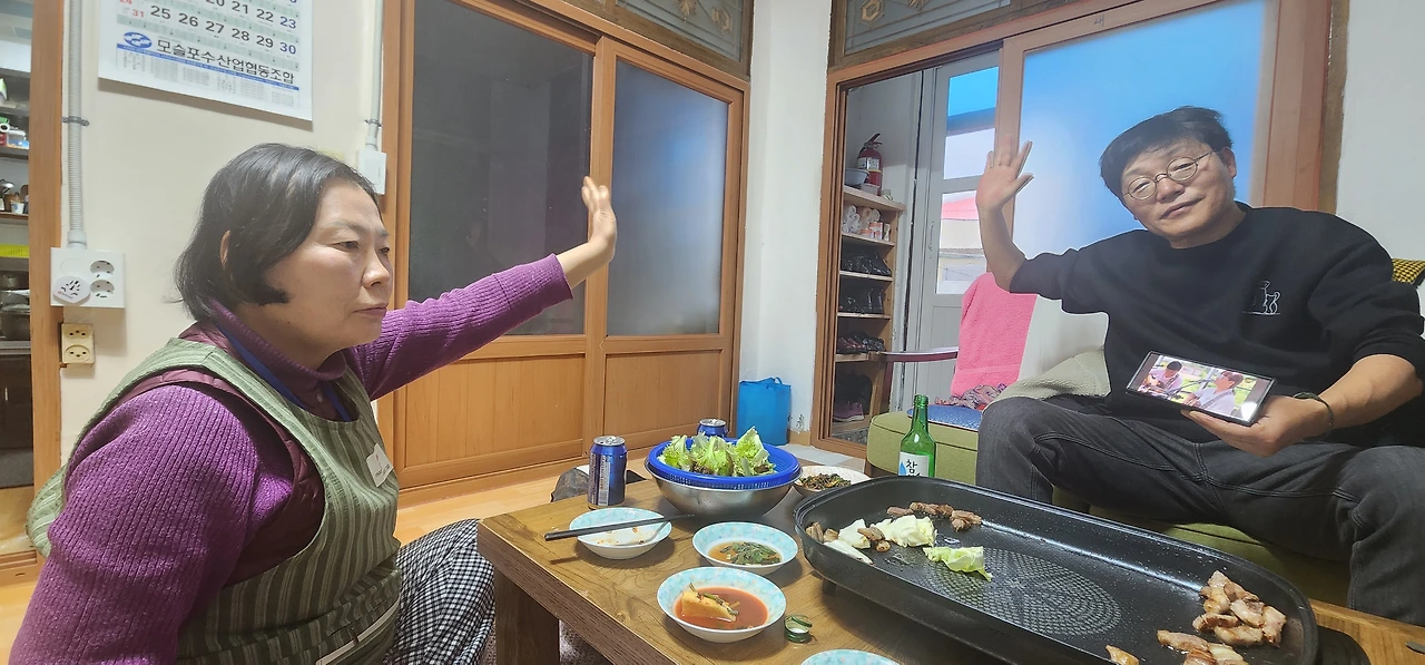 밭에서 따온 쌈 거리에, 새로 담근 파김치, 배추김치, 무김치, 쌈장을 미리 차려놓고 일찌 언니가 기다리고 있었다. 고기를 굽고 술 한 잔 하니 준비해 간 재료가 다 떨어졌다. 일찌 언니는 냉장고문을 열어 두툼한 삼겹살을 꺼낸다. 고기를 다 먹고, 구운 김치에 밥을 잔뜩 넣어 볶아서 먹으니 제주도말로 "배가 까질 것 같다."
