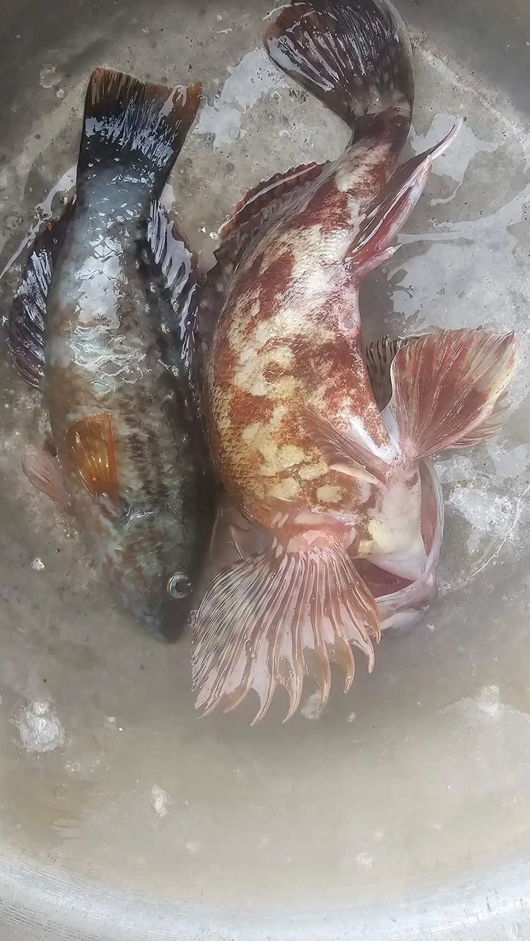 방파제에서 잡은 물고기 두 마리. 모두 고양이 밥으로 던져줬다.