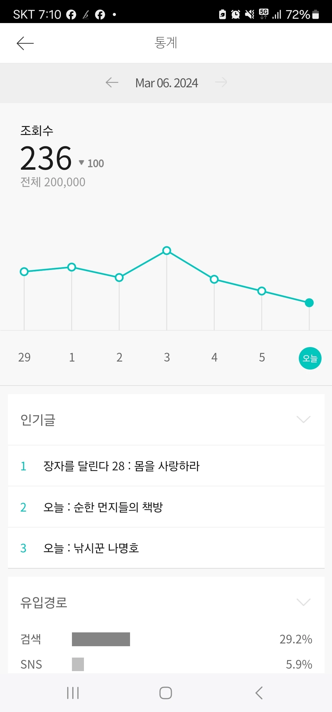 오늘 브런치를 보니 누적 조회수가 20만이 되었습니다.(어떤 분은 하루만에 달성할 수도 있겠지만, 제 경우에는 거북이 걸음과도 같았습니다. 저기까지 언제 가나 싶었는데 오늘 도착했네요. 스스로 박수를 쳐줬습니다.^^) 지인은 '인기작가'라 부러워했지만, 저 스스로 인기작가였던 적은 단 한 번도 없었다는 것을 압니다. 저는 인기작가가 아니라, 어떠한 상황에도 글쓰기를 멈추지 않았던 '끈기작가'일 뿐입니다. 제가 쓴 글을 계산했더니 1천 회가 넘었습니다. 거의 매일 글 하나는 올린 것입니다. 구멍가게에서 시작하여 매장(브런치북+매거진)을 30개 정도 마련했으니꽤 끈기를 발휘한 거죠.