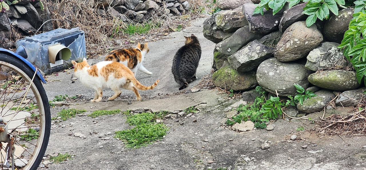 자기 영역이 아닌 곳에 방문하는 고양이들의 습성이 있다. 무리지어 몰려왔어도 한꺼번에 급식소로 와서 사료를 먹는 것이 아니라, 한 마리씩 식사하고 다른 고양이들은 주변을 경계한다. 만약에 그 영역을 지키는 고양이가 오면 재빨리 달아나려는 것이다. 내가 다가가면 먹는 것을 중단하고 모든 고양이들이 도망치는 모습을 여러 차례 목격했다. 그래서 이후로 다른 고양이들이 와 있으면 될 수 있는대로 움직임을 자제한다. 가만히 서있거나 의자에 앉아 식사가 끝나기만을 기다린다.