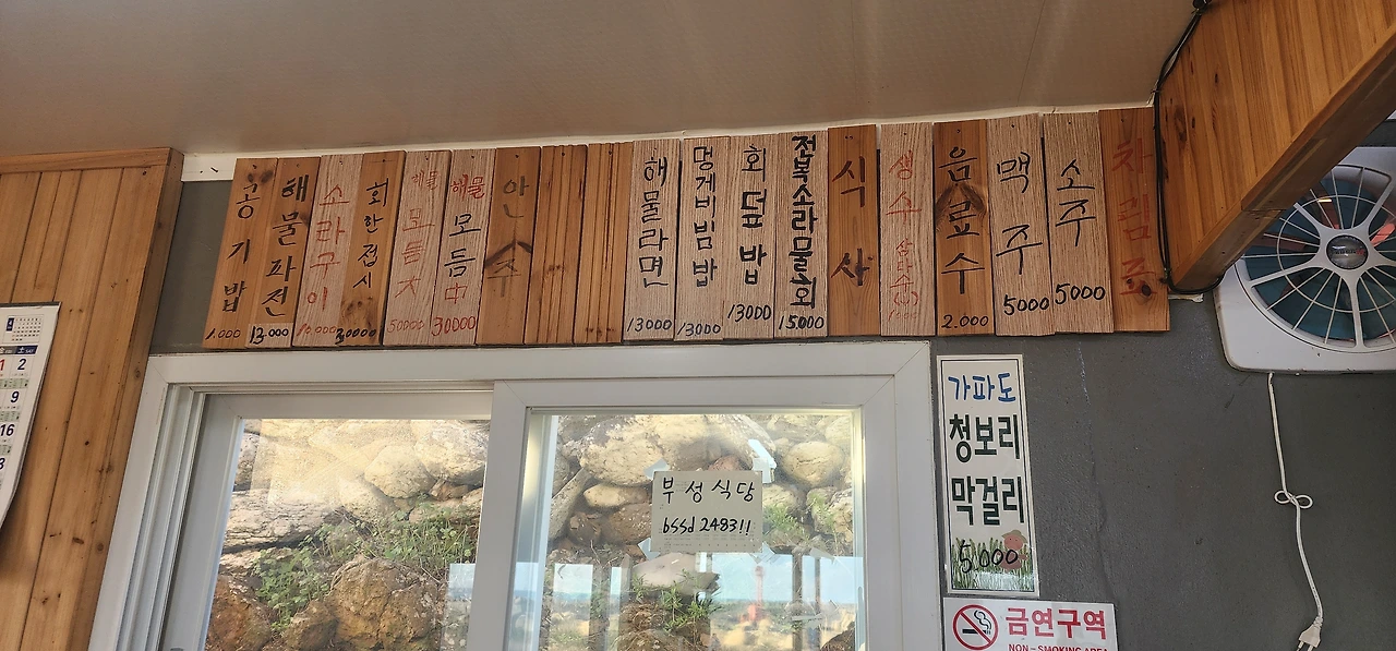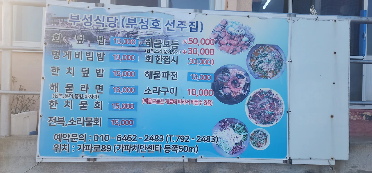 가파도로 이사와, 쓸쓸하고 허기진 몸과 마음을 채울 수 있는 단골집 하나 있었으면 좋겠다는 생각을 했었는데, 이제야 찾은 것 같다. 내가 가파도에 있는 동안, 나의 단골집은 부성식당으로 정했다. 크지 않고 아늑하고 푸짐하고 가격도 적당하다.