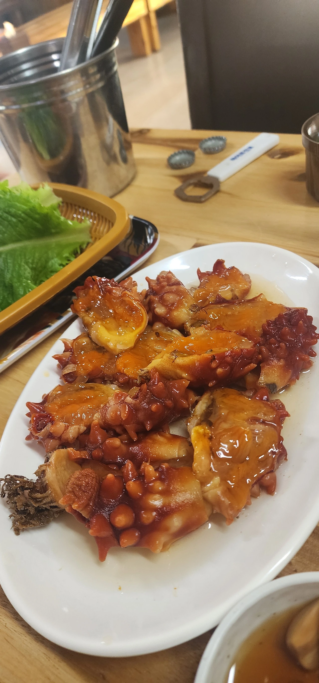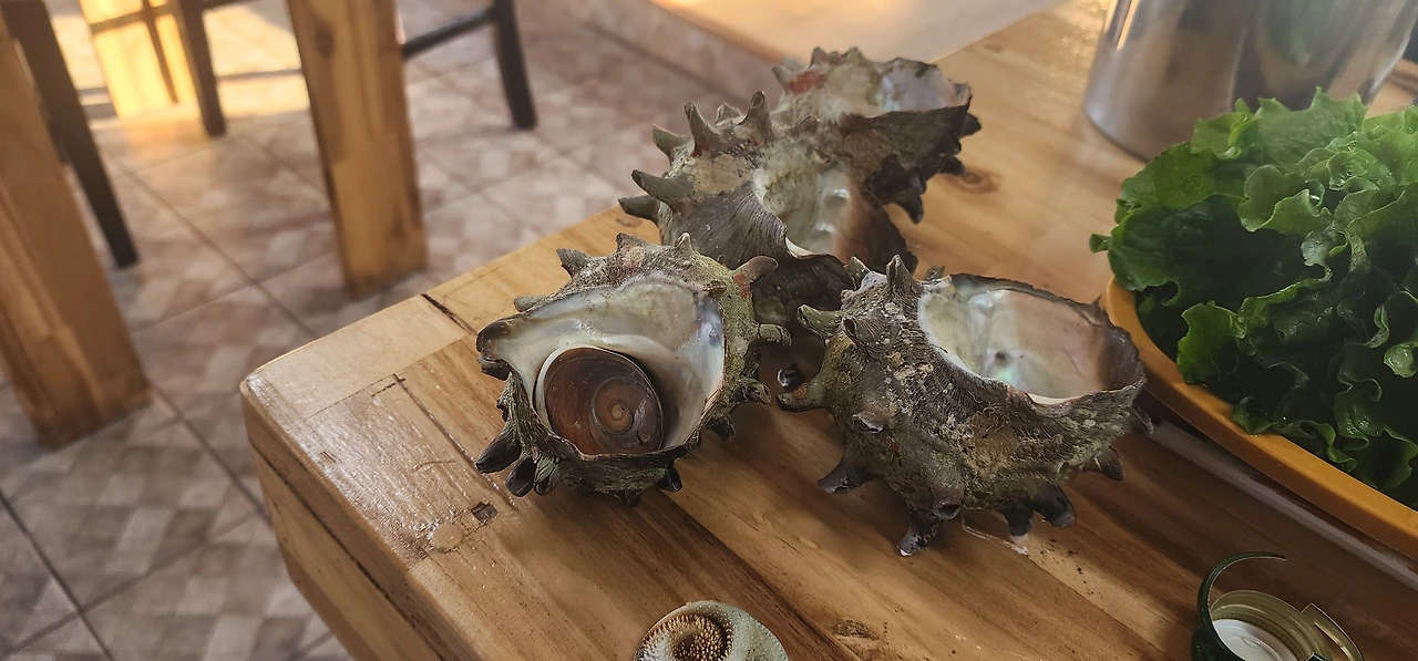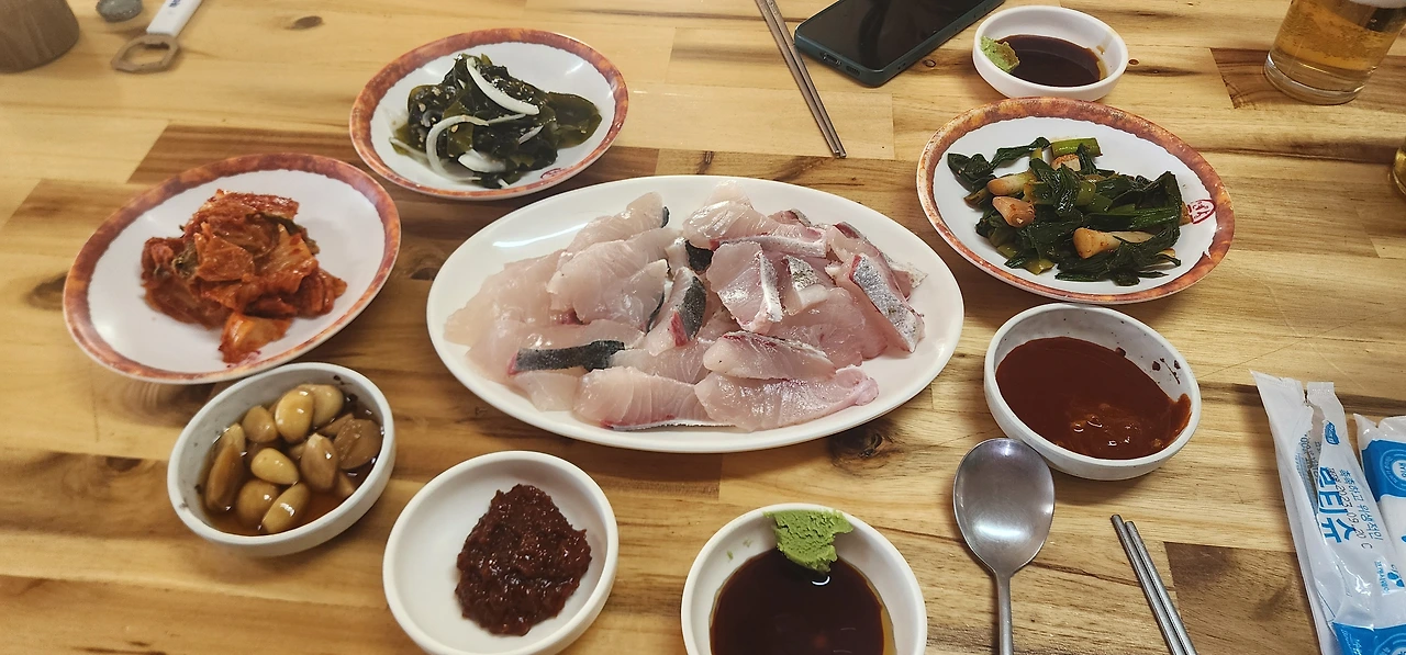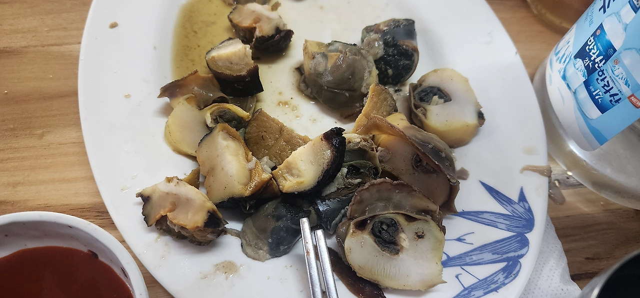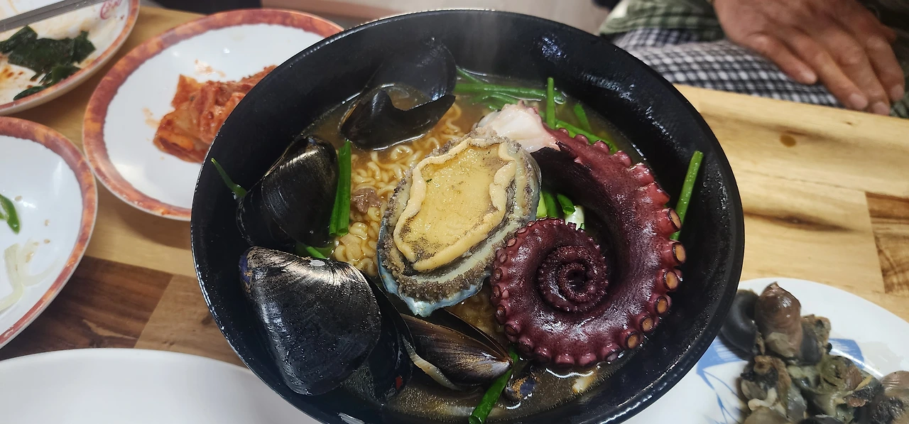 드디어 부성식당에서 식사(?)를 하게 되었다. 주인네는 제주도에 일 보러 나가고, 아들이 식당을 지키고 있다. 간단히(?) 부시리 회, 소라구이, 멍게를 시키고, 나는 소주를 일찌누나는 맥주를 마셨다. 나중에는 해물라면으로 마무리. 실컷 먹었는데도 5만 원 안팎이다. 역시 주민용 식당 - 그렇다고 주민만 받는 것은 아니다. 관광철에는 관광객, 숙박객, 주민들로 북적된다고 한다. -이라 그런데 저렴하고 알차다.