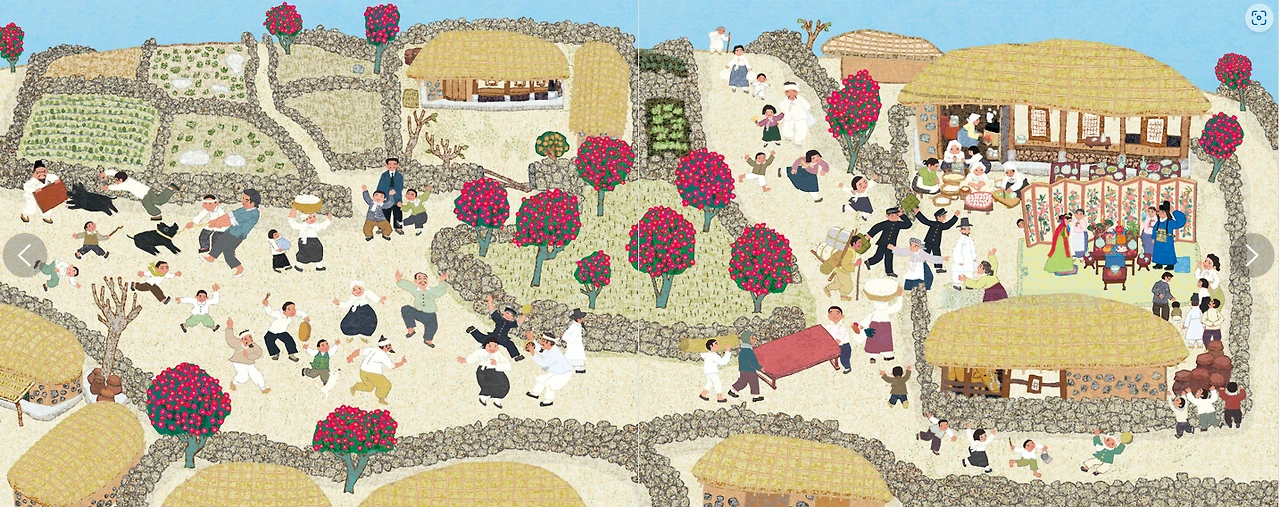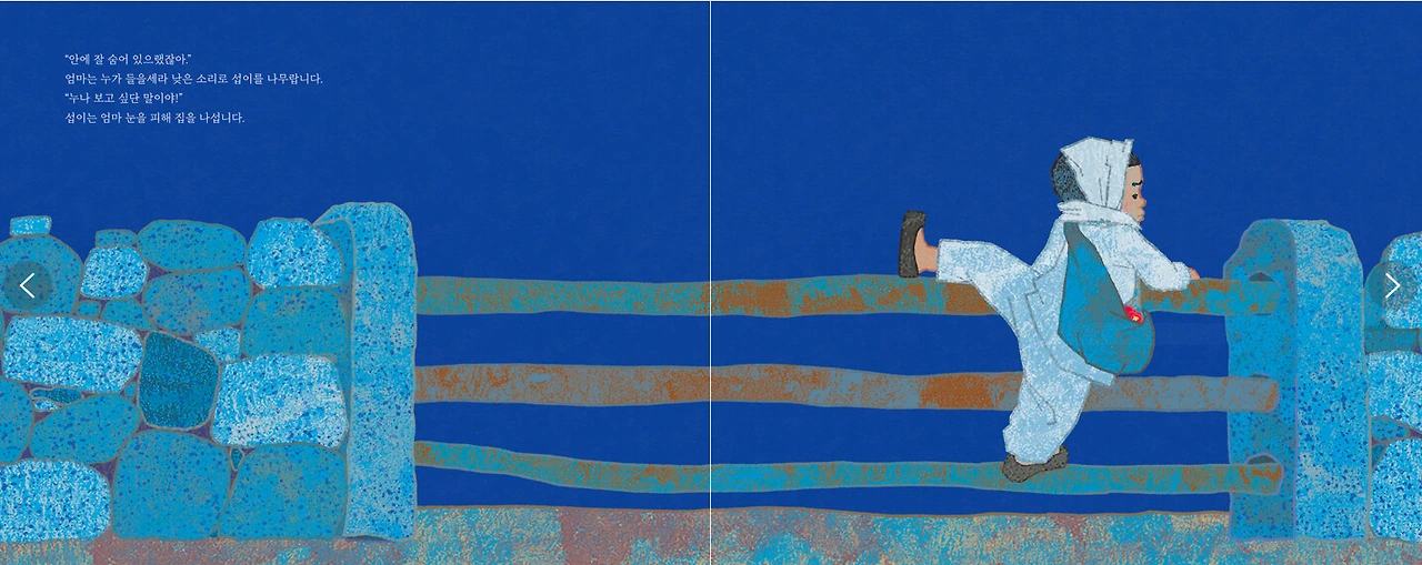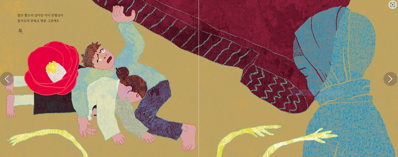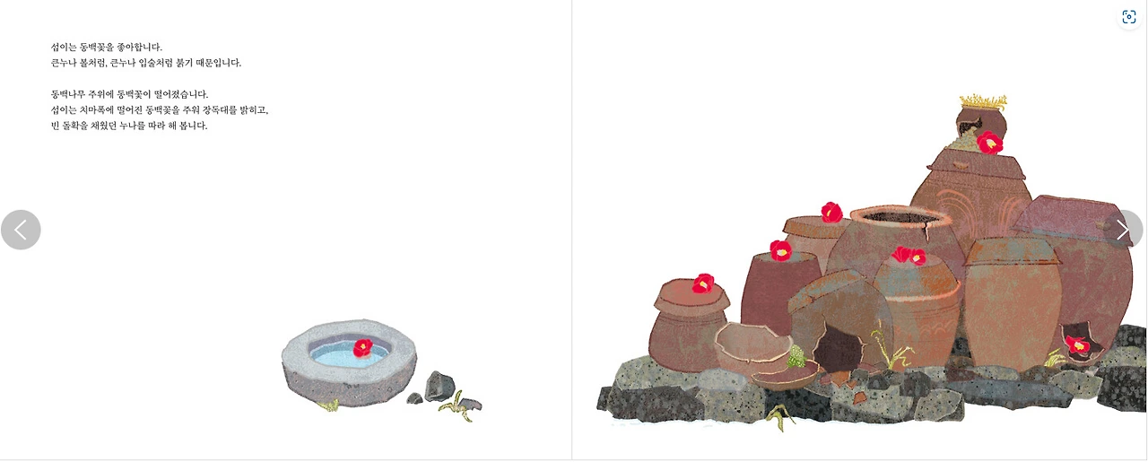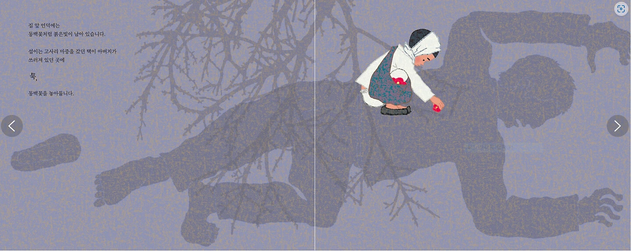 첫장을 넘기면 양면 가득 담겨있는 동백꽃과 동네 전경이 너무도 정겹다. 한 장을 더 넘기면 이야기가 시작된다. 동백꽃을 좋아하는 주인공 섭이는 어미의 만류에도 떨어진 동백꽃을 주으러 밖으로 나선다. 그 꽃들을 모아 오래도록 보지 못한 누나에게 보여주고 싶기 때문이다. 길을 걸으며 동백꽃을 줍는데 사라져 버린 사람들을 떠오른다. 섭이는 사람들이 누웠던 곳에 동백꽃을 툭, 내려놓는다. (다음 이야기는 생략해야겠다, 대신 출판사에서 공개한 그림 몇 컷을 옮겨놓는다.)