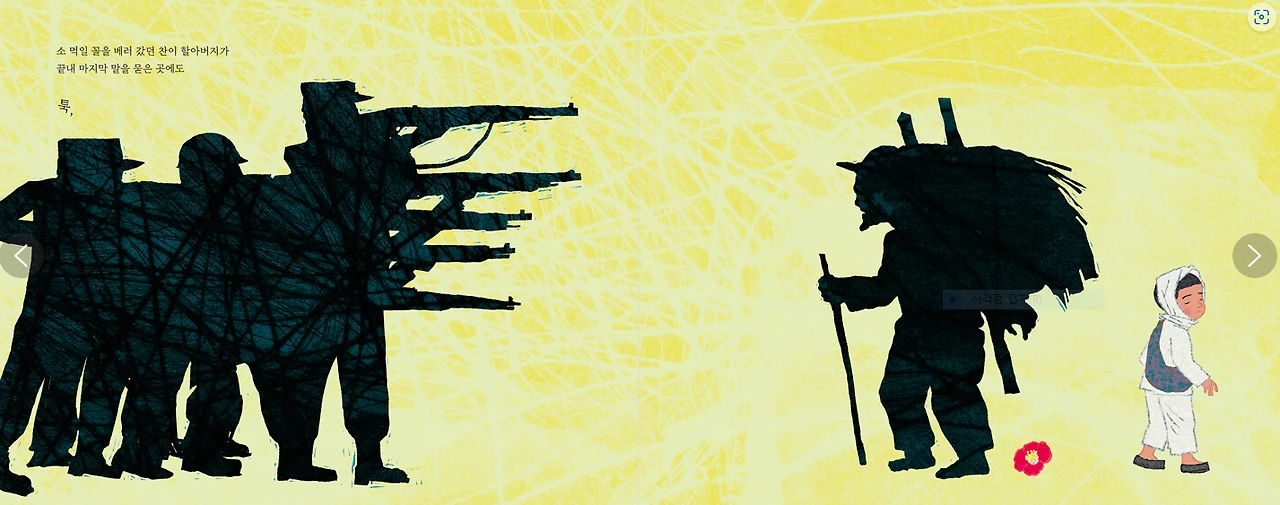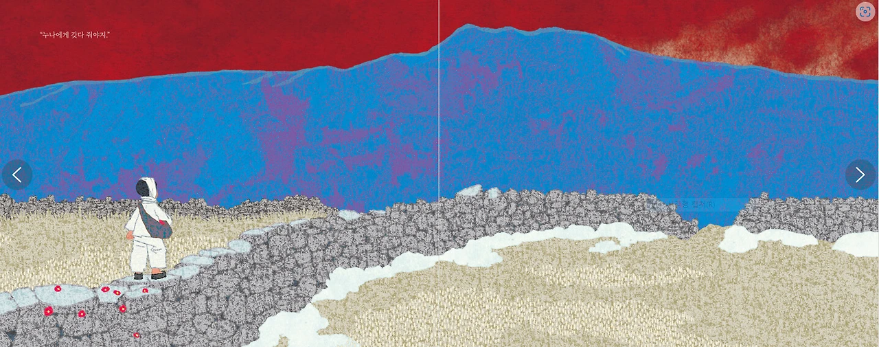 이 책보다 훨씬 구하기 쉽고 얇은 책으로는 김미희가 쓰고 정인성, 천복주 부부가 그린 <동백꽃이 툭,>이다. 이 책은 2022년 아르코 문학나눔책으로도 선정된 그림책으로 내가 꼽은 몇 안 되는 그림책 중 하나이다. 제주도와 4.3을 상징하는 동백꽃의 이미지를 이처럼 아름답게 그린 작품을 본 적이 없다. 오늘을 어린이에게 소개하고픈 사람은 이 책을 선택하면 된다.