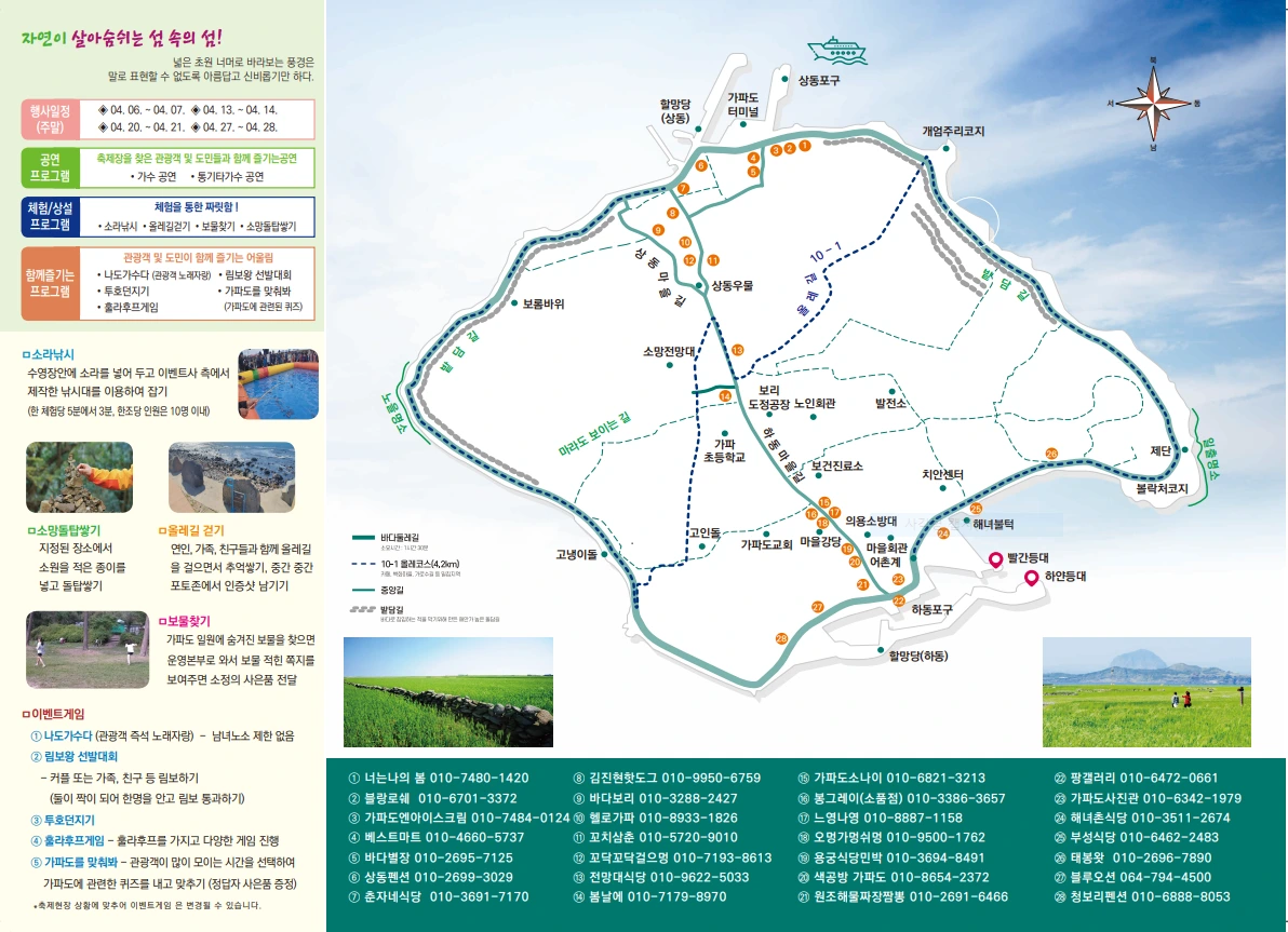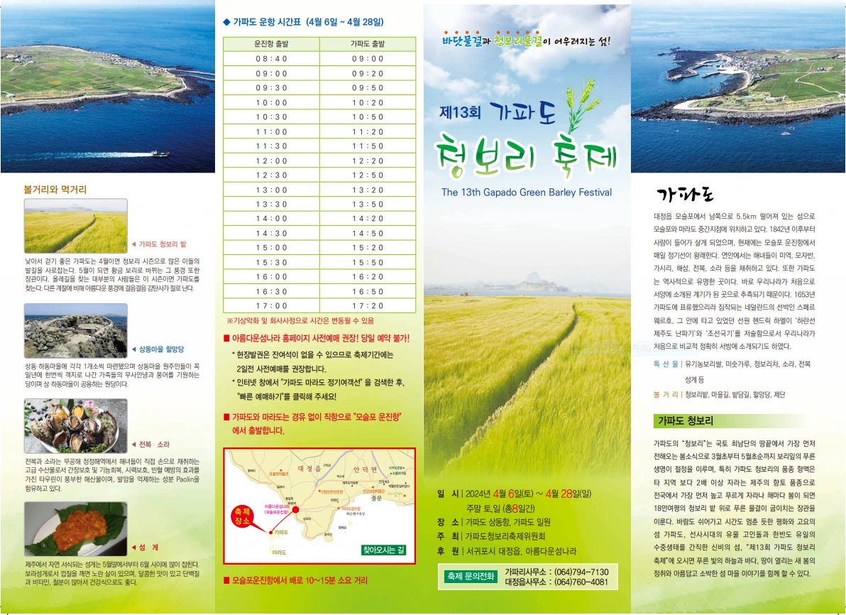 배편도 오전 9시부터 오후 5시 20분까지, 20분과 50분 단위로 가파도에서 출항한다. 하루에 18번의 배편을 마련하였다. 보리도정공장에서는 보리쌀을 200 가마 도정하여 상품화하고 있다. 유채꽃은 아직은 안간힘을 쓰고 피어있다. 곧 다른 봄꽃들이 만발할 것이다. 청보리는 쑥쑥 잘 자라고 있다. 날씨도 조금씩 따뜻해지고, 아침저녁이 길어지고 있다.
