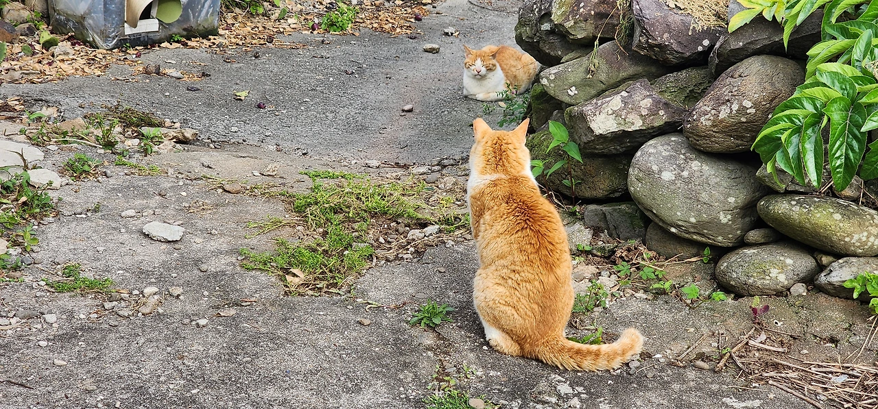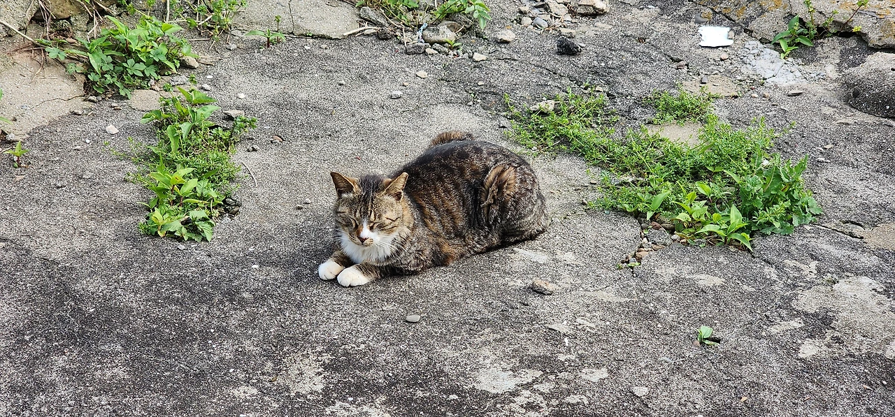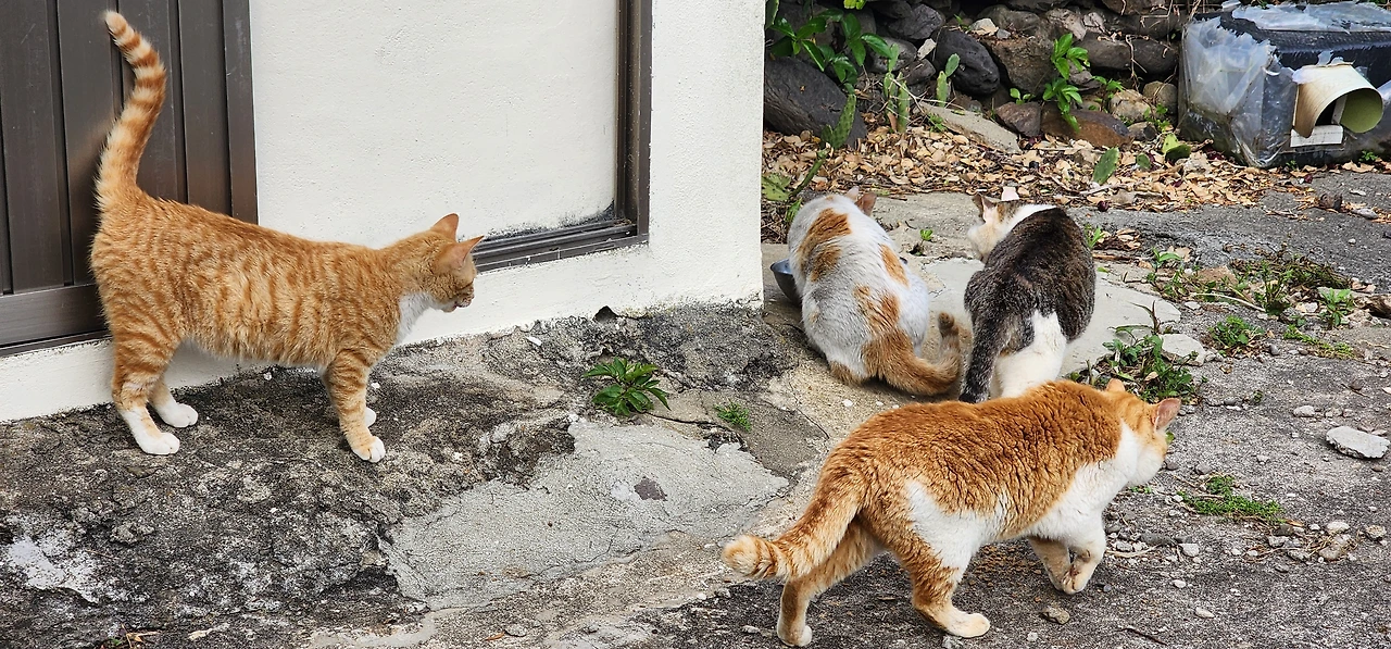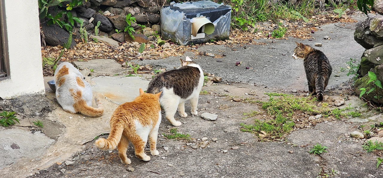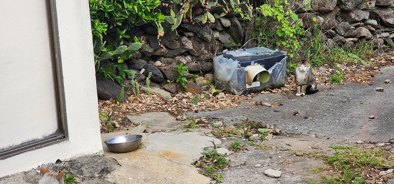 무인택배함에 들러 영진이네 택배를 찾아 배에 실었다. 이사 온 지 얼마 안돼 택배가 가득이다. 가파도 선착장에 내리니 영진이 아빠가 차로 대기 중이다. 편하게 차를 타고 집골목에 내려, 걸어 들어가는데 예전 같으면 나를 보자마자 피했던 골목 고양이들이 떼를 지어 모여있고, 나를 본 체 만 체 한다. 어랍쇼, 이것들이 이제 배짱이네.^^ 고양이를 지나 집으로 접어드는데 고양이들이 마당까지 따라와 쭉 자리를 잡는다.