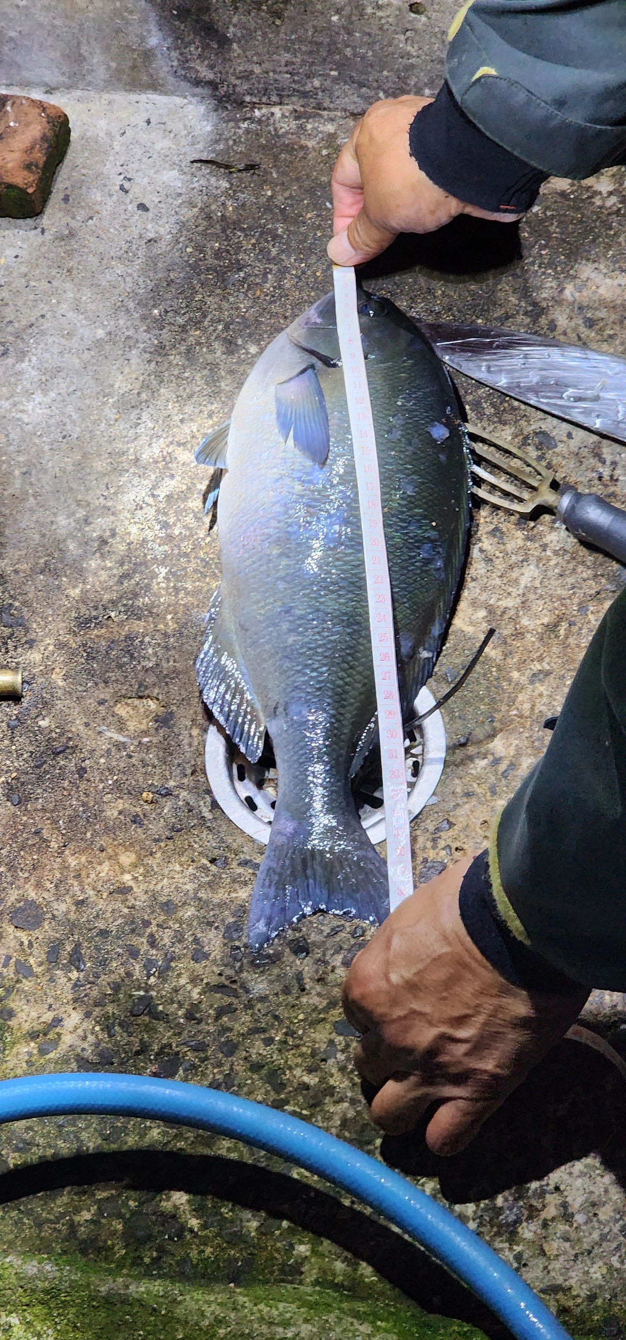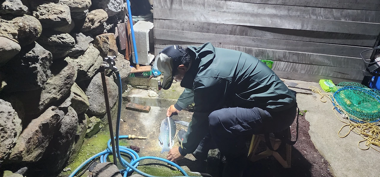 블루오션 민박집을 운영하는 김봉윤 형이다. 뱅에돔은 킬로 당 10만 원 정도 하는 귀한 물고기다. 4짜면 최소한 3킬로는 넘을 것이니 30만 원짜리 물고기를 잡고 초대한 것이다. 귀한 뱅에돔을 먹을 수 있는 기회를 어찌 놓칠 것인가?