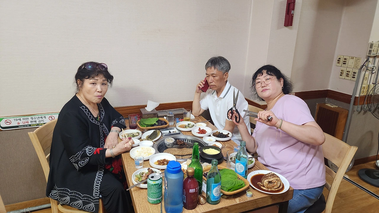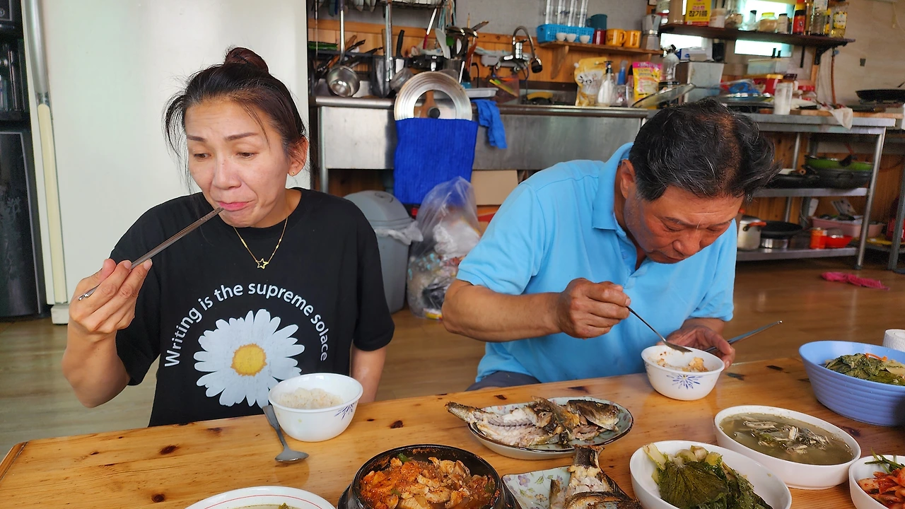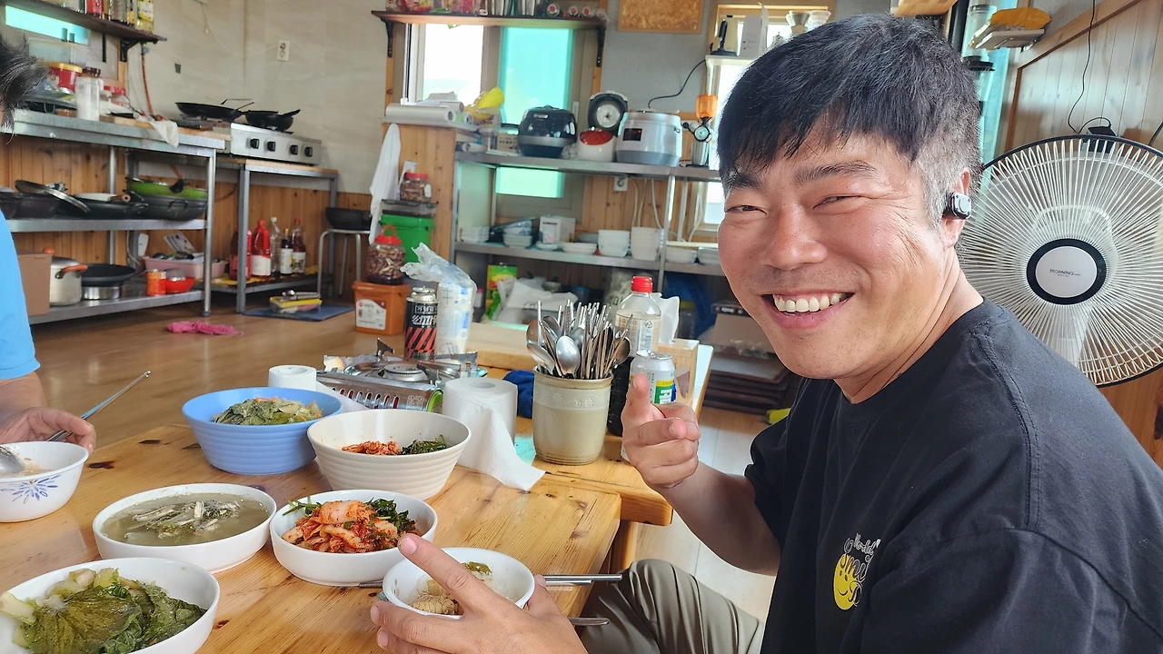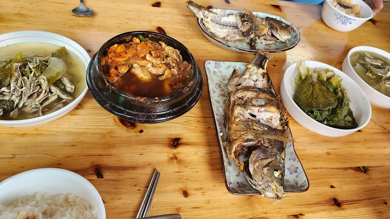 일찍 잠자리에 들어 혼곤히 잠에 들었다가 출근시간이 다되어 일어났다. 밥도 먹지 못하고 허겁지겁 자전거를 타고 터미널에 도착하여 매표를 시작한다. 점심시간이 다 되어 가는데, 영진이 아빠가 와서 어제 벤자리를 많이 잡아 점심으로 구워 먹으려고 하는데 같이 가잖다. Why Not? 심지어 차까지 빌려 타고 다시 블루오션으로 가서 어제 먹은 멜국과 벤자리 알탕, 벤자리 구이 3종 세트로 점심식사를 푸짐하게 한다.