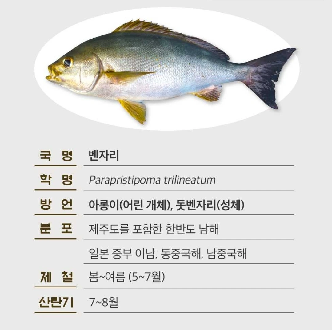 벤자리(Chicken grunt)는 수온 20도 이상에서 먹이활동이 활발한 아열대성 어류다. 한국에서는 주로 남부지역에서 많이 잡히는데, 제주도(특히 가파도)에서 잡은 벤자리가 최고의 맛을 자랑한다. 크기에 따라 30cm 이하는 '아롱이'이라 부르고, 45~50cm가 넘어가는 큰 벤자리는 '돗벤자리'라고 부르며 특급대우를 해준다. (영진 아빠가 잡고, 우리가 구워먹은 벤자리는 돗벤자리였다.) 맛이 달고, 향기로우며 육질아 쫄깃하여 회로도 최고로 여기고, 일본에서는 조림의 최고 재료로 꼽는다. 뼈가 갈치처럼 크고 단단하여 구워먹거나 졸여먹을 때, 조심해야 한다. 주로 5~6월에 잡히는 어종이다.