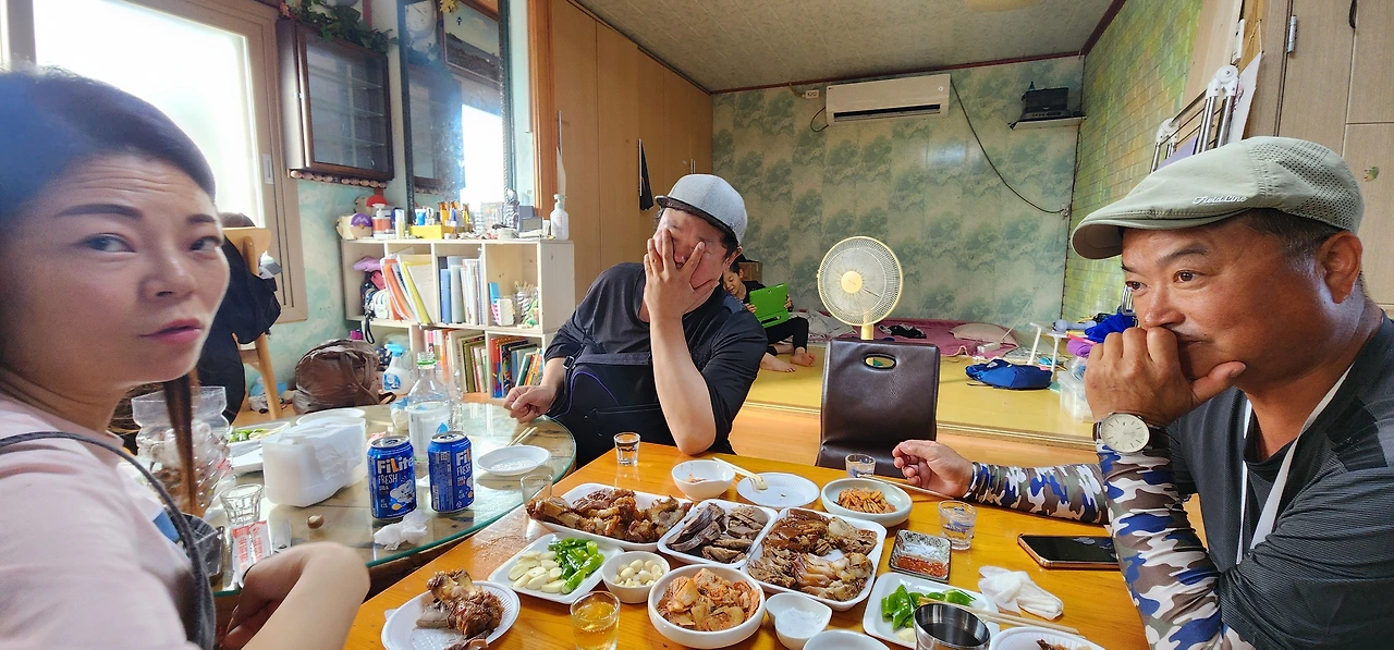 7월 15일 초복이야기는 고양신문 칼럼을 통해서 조만간 공개될 것이라, 중복을 피하기 위해 초복 다음날(7월 16일) 이야기를 해야겠다. 초복날 홀아비 셋이서 지낸 것을 불쌍히(?) 여긴 시원이네 아빠와 엄마가 초복 다음날, 족발과 염통을 바리바리 싸들고 가파도로 들어왔다. 복날 고기를 못 먹은 사람들 모이라고 주변에 연락하여 시원이네 집에 모였다.