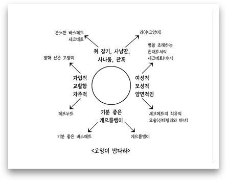그래서 저자는 이렇게 말한다. "고양이가 사냥하는 모습을 잔인하다고 말하는 사람도 있는데, 고양이 입장에서는 그저 고양이로서 본분을 다할 뿐 문제 될 게 없다. 물론 고양이 특유의 성격도 있겠지만, 일반적으로 고양이에 대해 이러쿵저러쿵 말이 많은 인간은 본인의 성격을 그대로 고양이에 투영하는 경우가 많다. 따라서 옛날부터 인간이 그려온 고양이의 수많은 이미지에는 인간의 특성이 반영되어 있다고 볼 수 있다. 지금부터 소개할 고양이를 주인공으로 하는 다양한 이야기와 소설을 한마디로 정리하자면, 인간의 영혼에 대한 이야기라 할 수 있다."(26쪽)