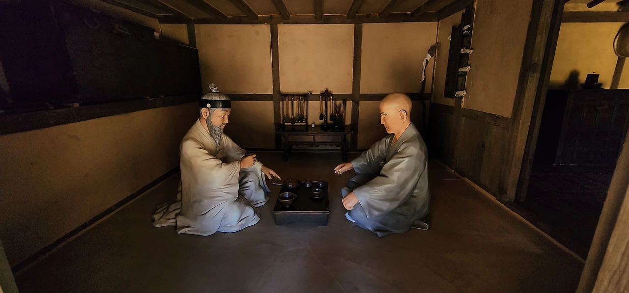 모거리 방에는 초의선사와 추사가 마주 앉아 차를 마시는 모습을 재현해 놓았다. 둘이 앉았는데 방이 꽉 찼다. 밖거리 방에도 추사가 학동 3명을 가르치는 모습을 재현해 놓았다. 아이들이 불편해 보였다. 그러니 당시에는 불편이 기본값이었던 것 아닐까? 아니, 내가 생각하는 불편과 그들이 생각하는 불편이 다른 것은 아닐까? 내 불편은 사치에 가까운 것은 아닐까? 이런 생각에 문득 부끄러워졌다.