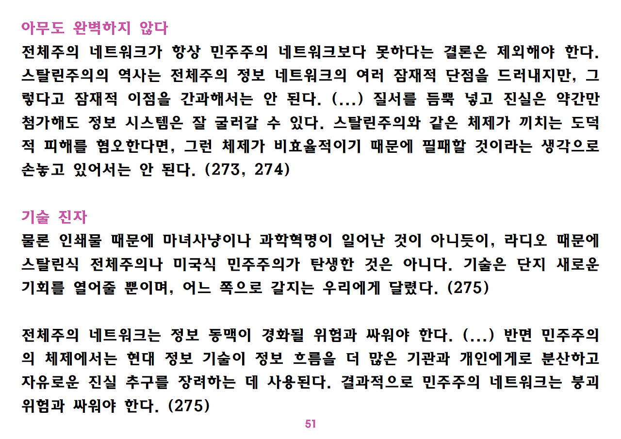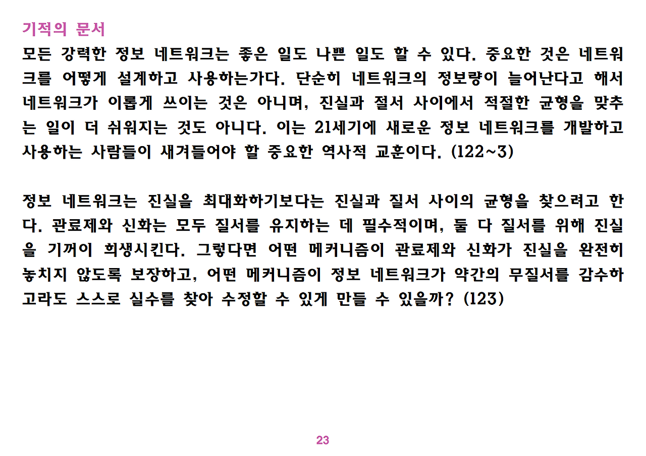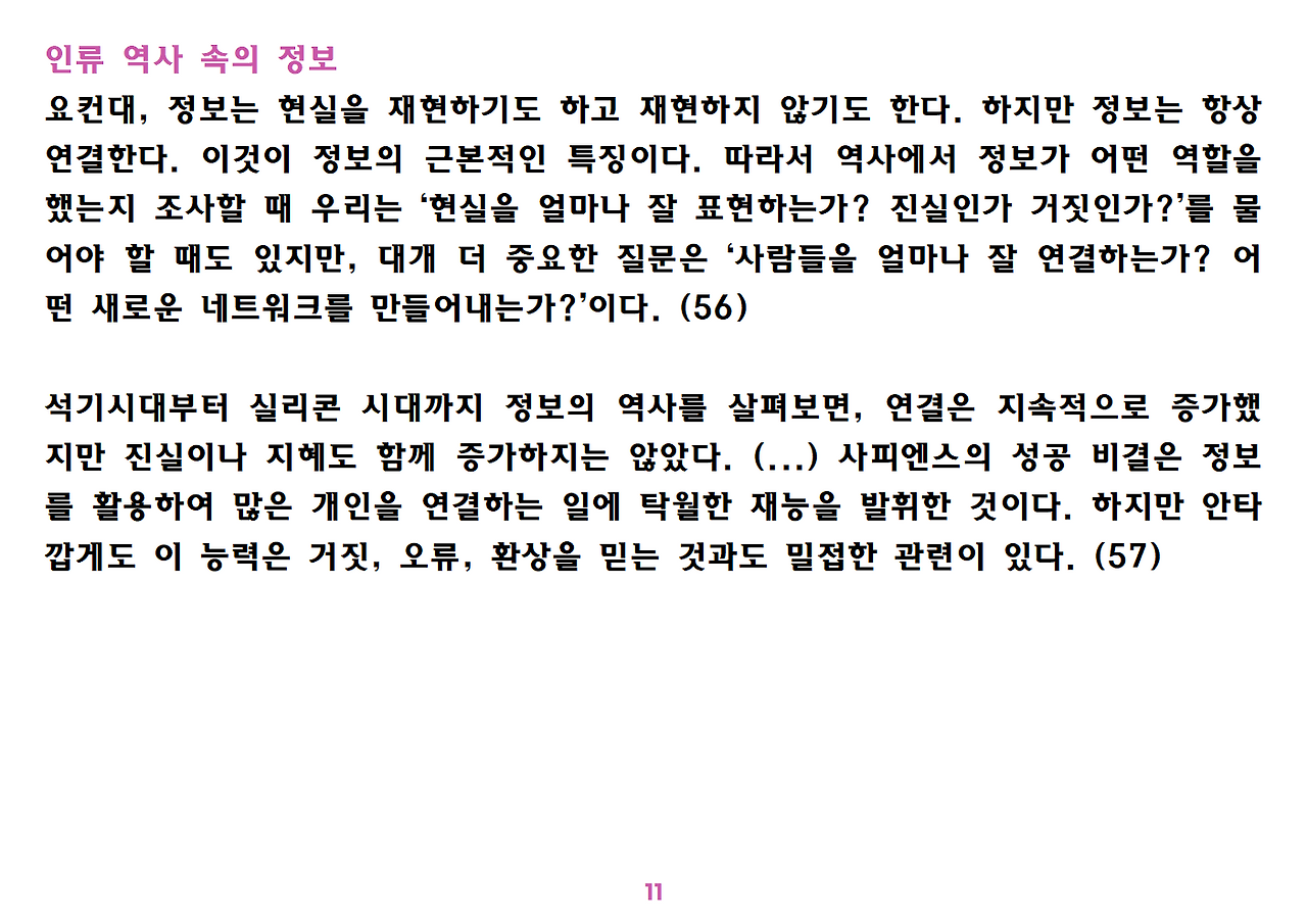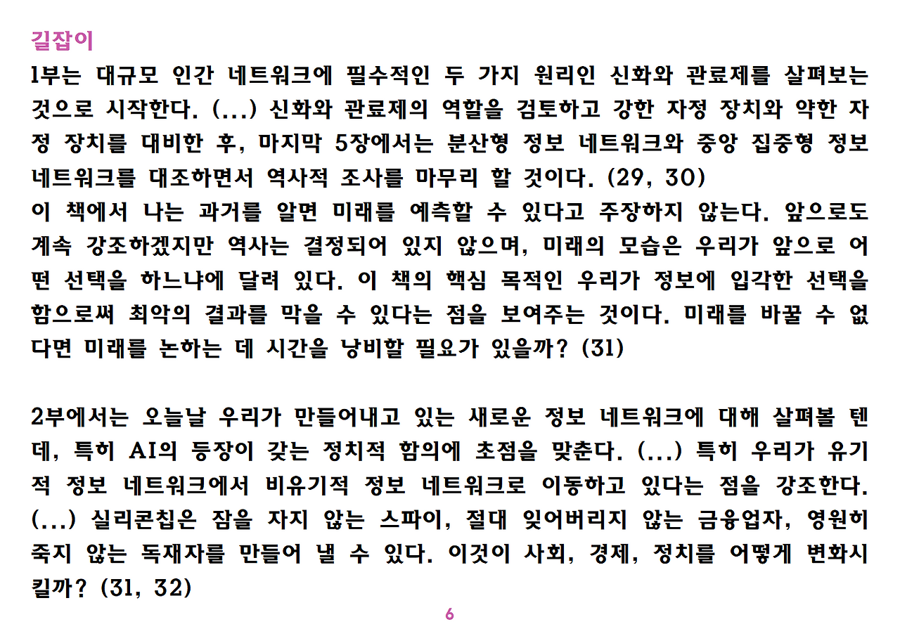 (독자가 지적해서 확인해보니) 유발 하라리의 인류학 3부작은 <사피엔스>, <호모 데우스>, <21세기를 위한 21가지 제언>이다. <사피엔스>에서는 인간(사피엔스)가 어떻게 지구의 최종 승자가 됐는지를 이야기했고, <호모 데우스>에서는 인간의 네트워크의 중심이 어떻게 신에서 인간으로, 인간에서 인터넷 데이터로 넘어갔는지. <21세기~>에서는 21세기를 살아가는 현대인이 어떤 문제에 봉착했으며 이를 어떻게 성찰해야 하는지 살폈다. <사피엔스> 이후 6년만에 <넥서스>가 나왔다. <넥서스>에서는 인간의 역사를 정보와 네트워크의 역사로 다시 조명하면서, 인간을 매개로 하지 않는 AI가 등장한 후 인간의 삶은 어떻게 바뀔지, 지구의 최종지배질서가 민주주의 혹은 전체주의가 될지, 아니면 AI가 될지를 살핀다. 그중에서 앞의 세 권의 책은 이미 발췌 정리하여 올렸고, 이제 마지막으로 <넥서스>를 올린다. (상업적 사용은 하지 마시길) 즐공!