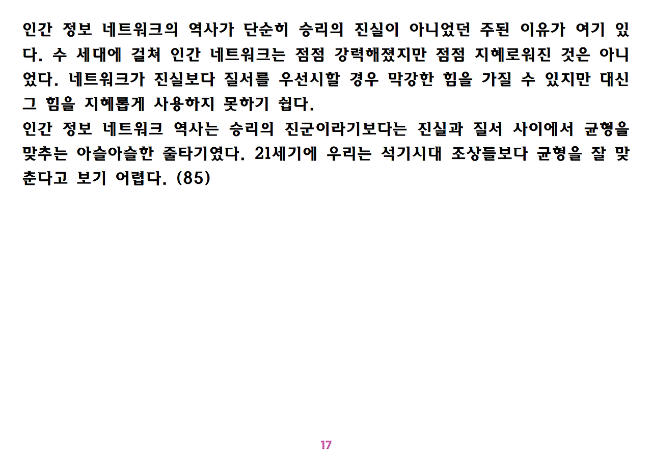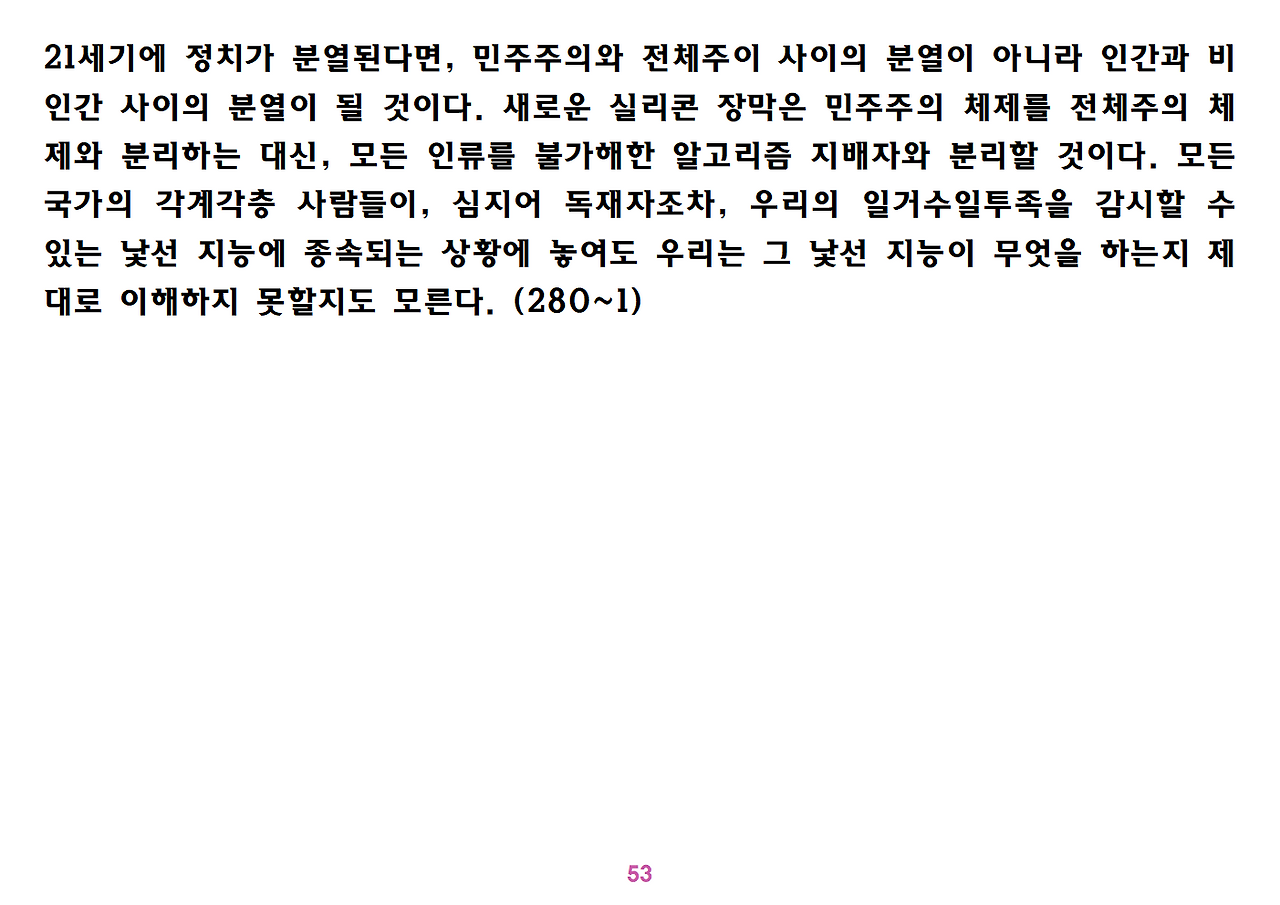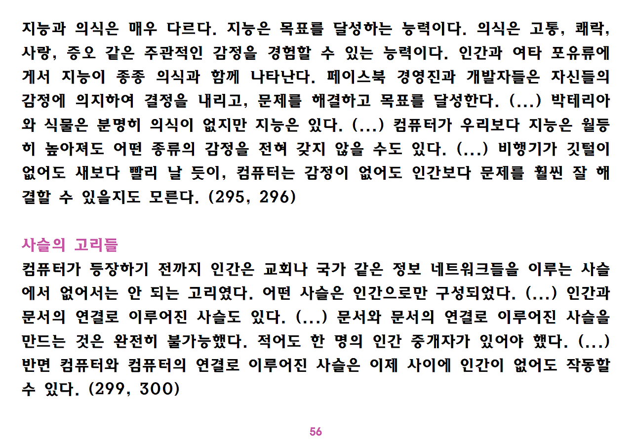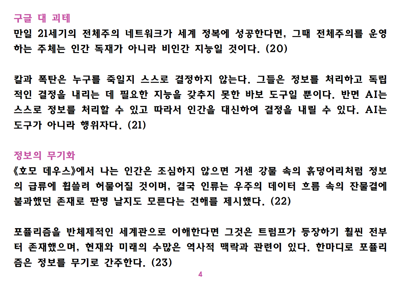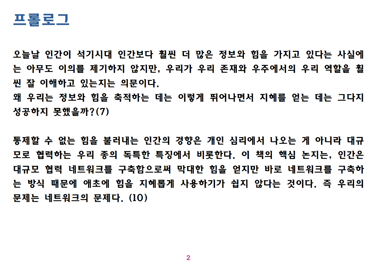 (독자가 지적해서 확인해보니) 유발 하라리의 인류학 3부작은 <사피엔스>, <호모 데우스>, <21세기를 위한 21가지 제언>이다. <사피엔스>에서는 인간(사피엔스)가 어떻게 지구의 최종 승자가 됐는지를 이야기했고, <호모 데우스>에서는 인간의 네트워크의 중심이 어떻게 신에서 인간으로, 인간에서 인터넷 데이터로 넘어갔는지. <21세기~>에서는 21세기를 살아가는 현대인이 어떤 문제에 봉착했으며 이를 어떻게 성찰해야 하는지 살폈다. <사피엔스> 이후 6년만에 <넥서스>가 나왔다. <넥서스>에서는 인간의 역사를 정보와 네트워크의 역사로 다시 조명하면서, 인간을 매개로 하지 않는 AI가 등장한 후 인간의 삶은 어떻게 바뀔지, 지구의 최종지배질서가 민주주의 혹은 전체주의가 될지, 아니면 AI가 될지를 살핀다. 그중에서 앞의 세 권의 책은 이미 발췌 정리하여 올렸고, 이제 마지막으로 <넥서스>를 올린다. (상업적 사용은 하지 마시길) 즐공!