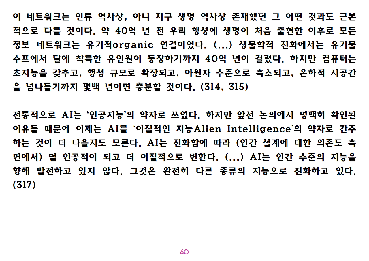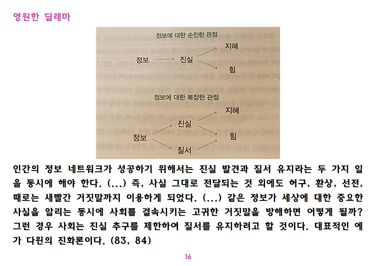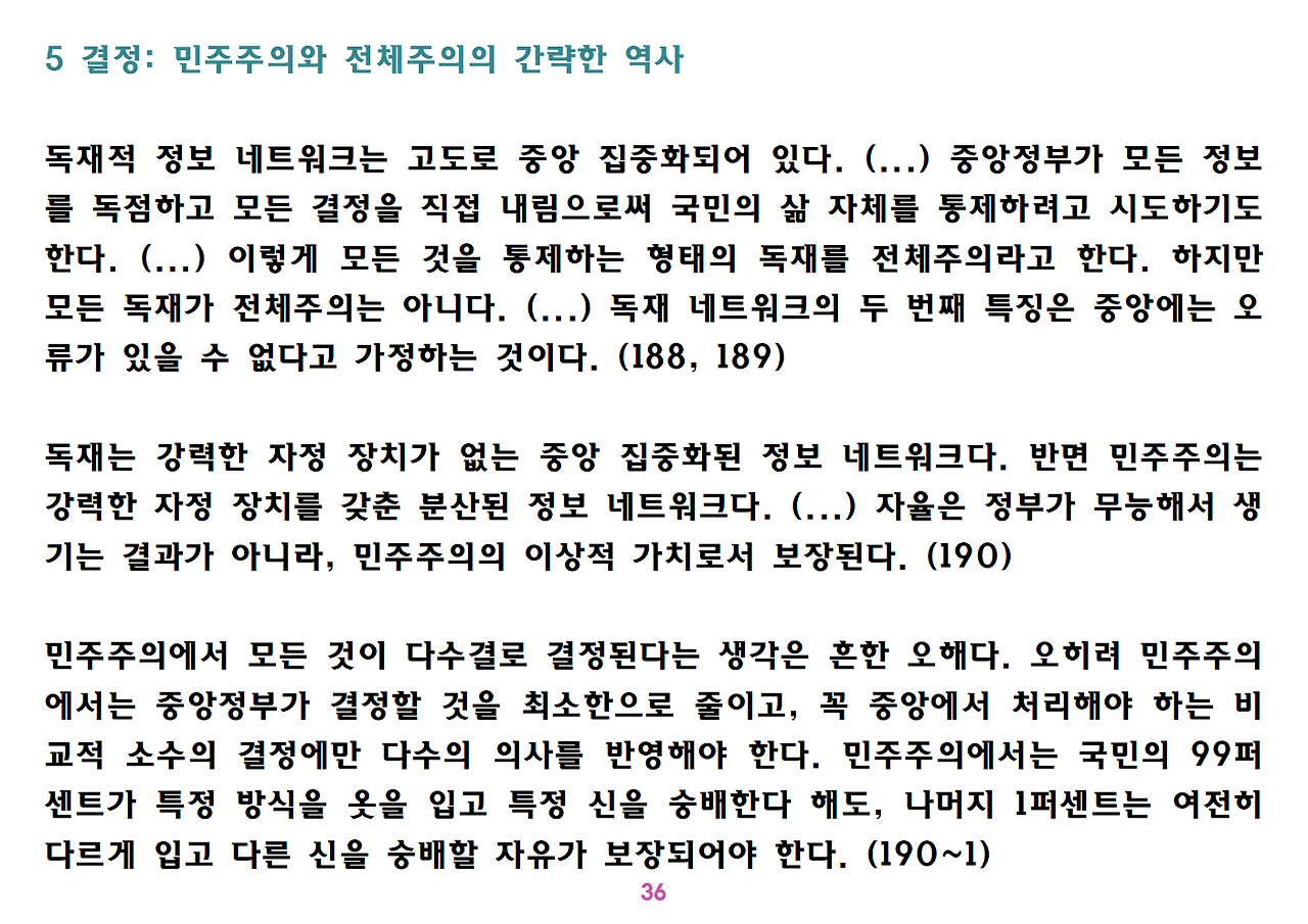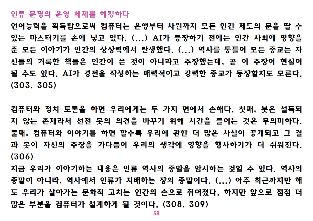 (독자가 지적해서 확인해보니) 유발 하라리의 인류학 3부작은 <사피엔스>, <호모 데우스>, <21세기를 위한 21가지 제언>이다. <사피엔스>에서는 인간(사피엔스)가 어떻게 지구의 최종 승자가 됐는지를 이야기했고, <호모 데우스>에서는 인간의 네트워크의 중심이 어떻게 신에서 인간으로, 인간에서 인터넷 데이터로 넘어갔는지. <21세기~>에서는 21세기를 살아가는 현대인이 어떤 문제에 봉착했으며 이를 어떻게 성찰해야 하는지 살폈다. <사피엔스> 이후 6년만에 <넥서스>가 나왔다. <넥서스>에서는 인간의 역사를 정보와 네트워크의 역사로 다시 조명하면서, 인간을 매개로 하지 않는 AI가 등장한 후 인간의 삶은 어떻게 바뀔지, 지구의 최종지배질서가 민주주의 혹은 전체주의가 될지, 아니면 AI가 될지를 살핀다. 그중에서 앞의 세 권의 책은 이미 발췌 정리하여 올렸고, 이제 마지막으로 <넥서스>를 올린다. (상업적 사용은 하지 마시길) 즐공!