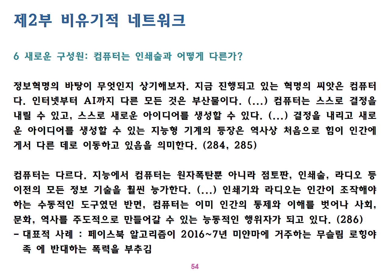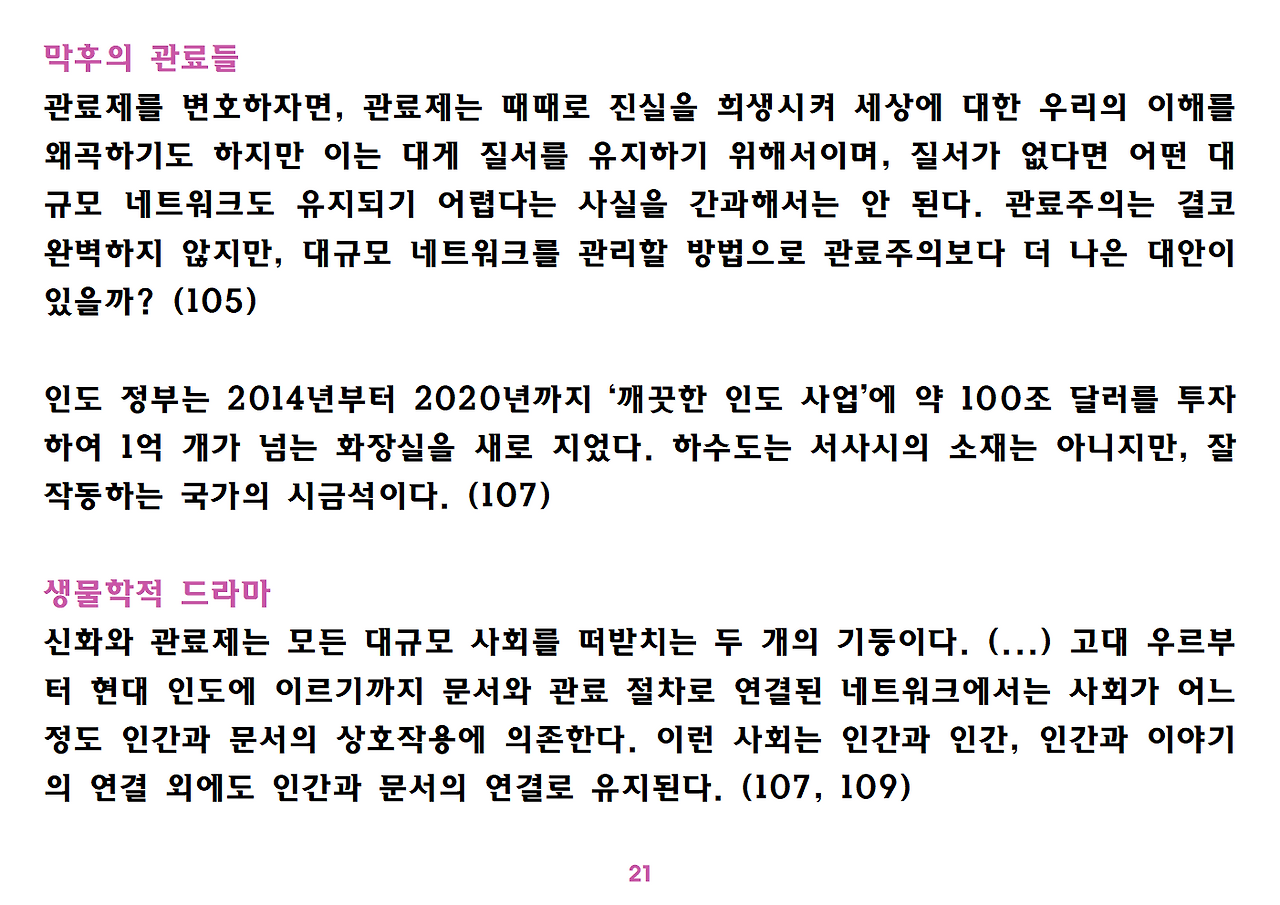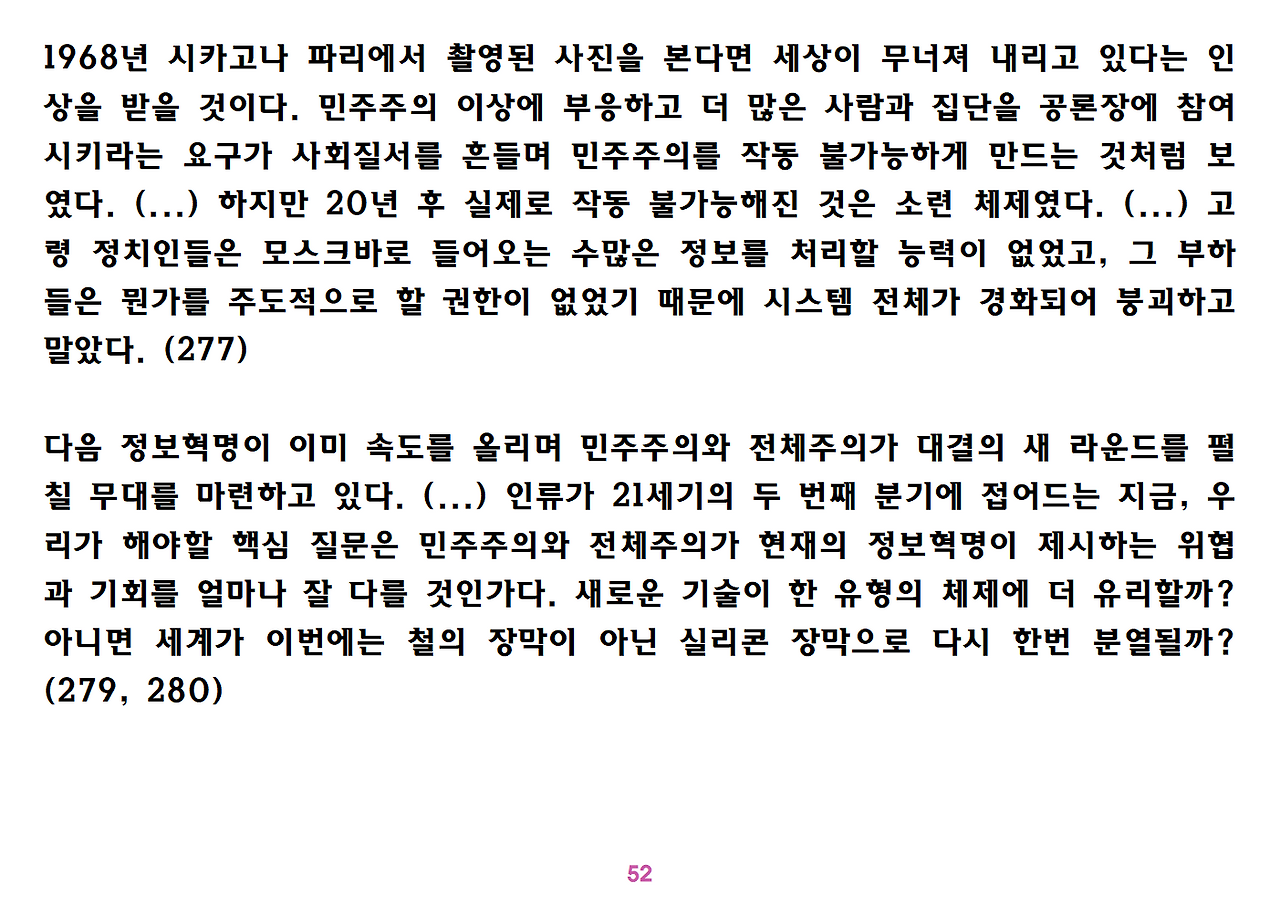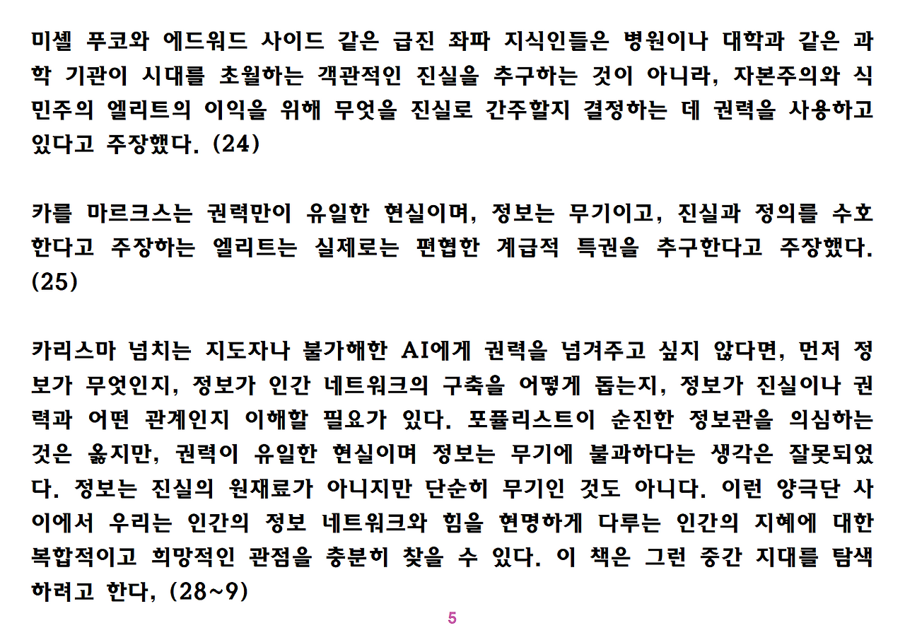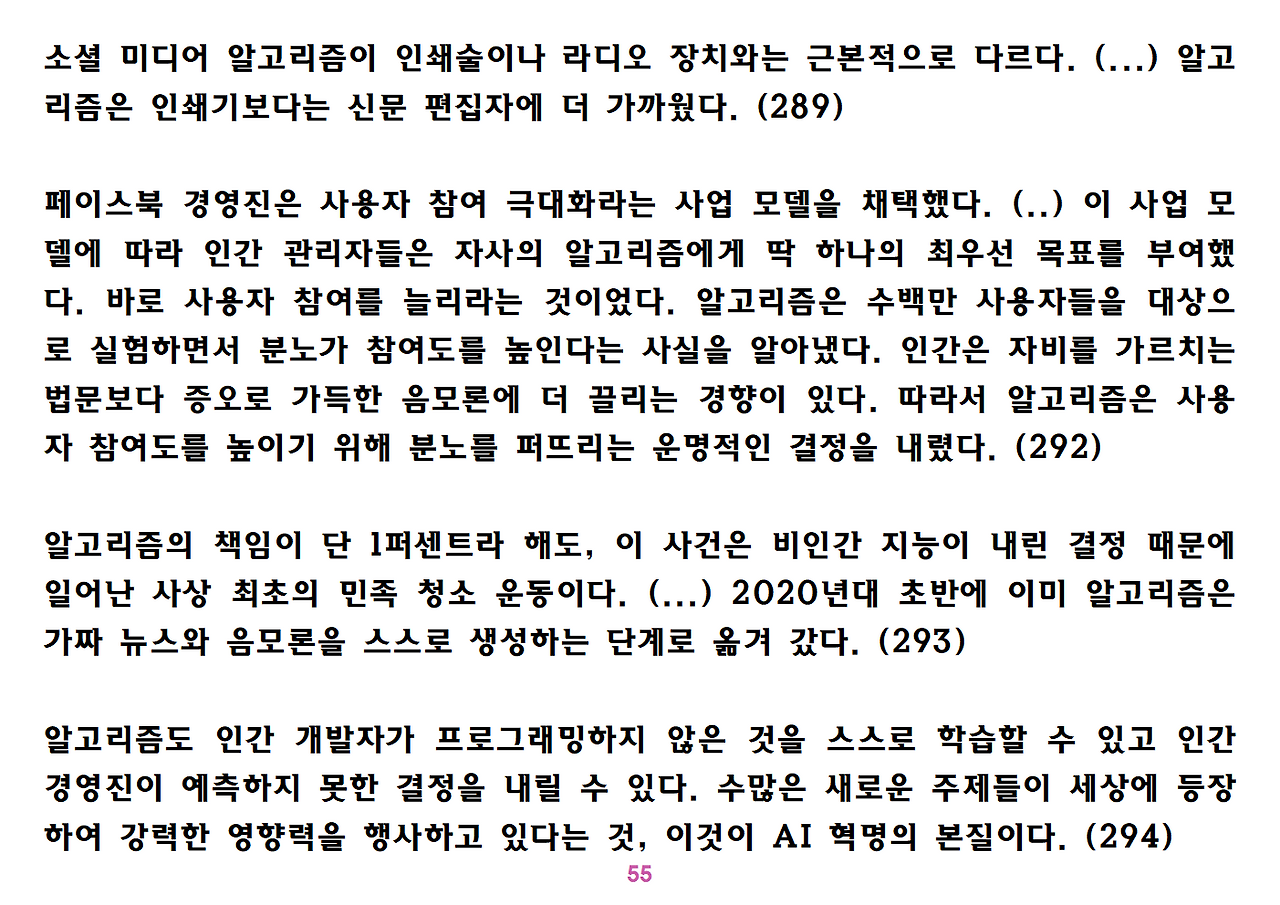 (독자가 지적해서 확인해보니) 유발 하라리의 인류학 3부작은 <사피엔스>, <호모 데우스>, <21세기를 위한 21가지 제언>이다. <사피엔스>에서는 인간(사피엔스)가 어떻게 지구의 최종 승자가 됐는지를 이야기했고, <호모 데우스>에서는 인간의 네트워크의 중심이 어떻게 신에서 인간으로, 인간에서 인터넷 데이터로 넘어갔는지. <21세기~>에서는 21세기를 살아가는 현대인이 어떤 문제에 봉착했으며 이를 어떻게 성찰해야 하는지 살폈다. <사피엔스> 이후 6년만에 <넥서스>가 나왔다. <넥서스>에서는 인간의 역사를 정보와 네트워크의 역사로 다시 조명하면서, 인간을 매개로 하지 않는 AI가 등장한 후 인간의 삶은 어떻게 바뀔지, 지구의 최종지배질서가 민주주의 혹은 전체주의가 될지, 아니면 AI가 될지를 살핀다. 그중에서 앞의 세 권의 책은 이미 발췌 정리하여 올렸고, 이제 마지막으로 <넥서스>를 올린다. (상업적 사용은 하지 마시길) 즐공!