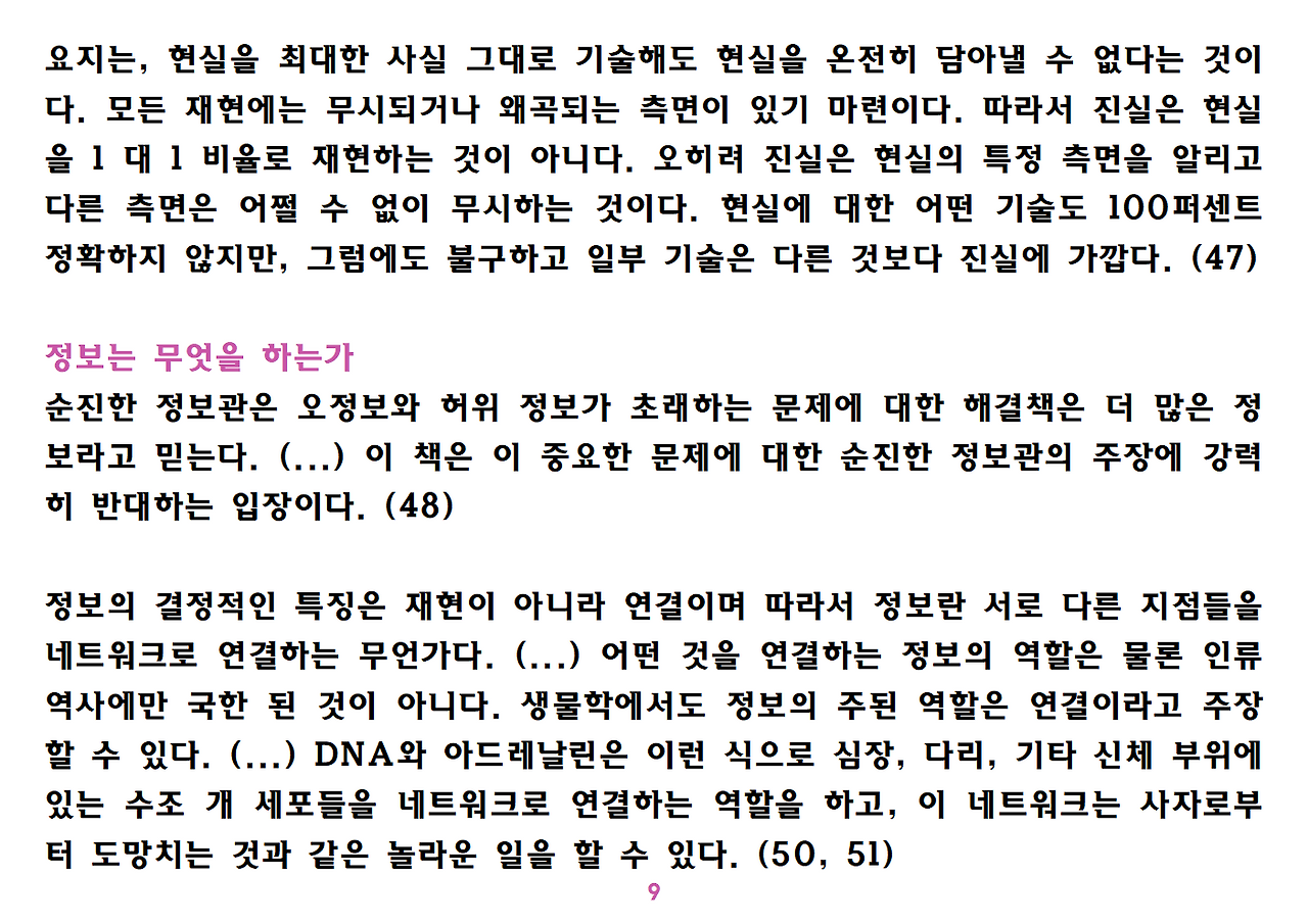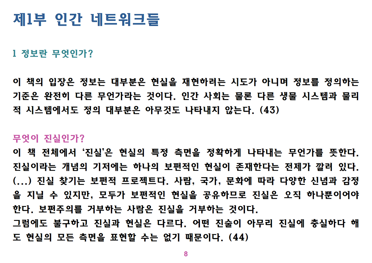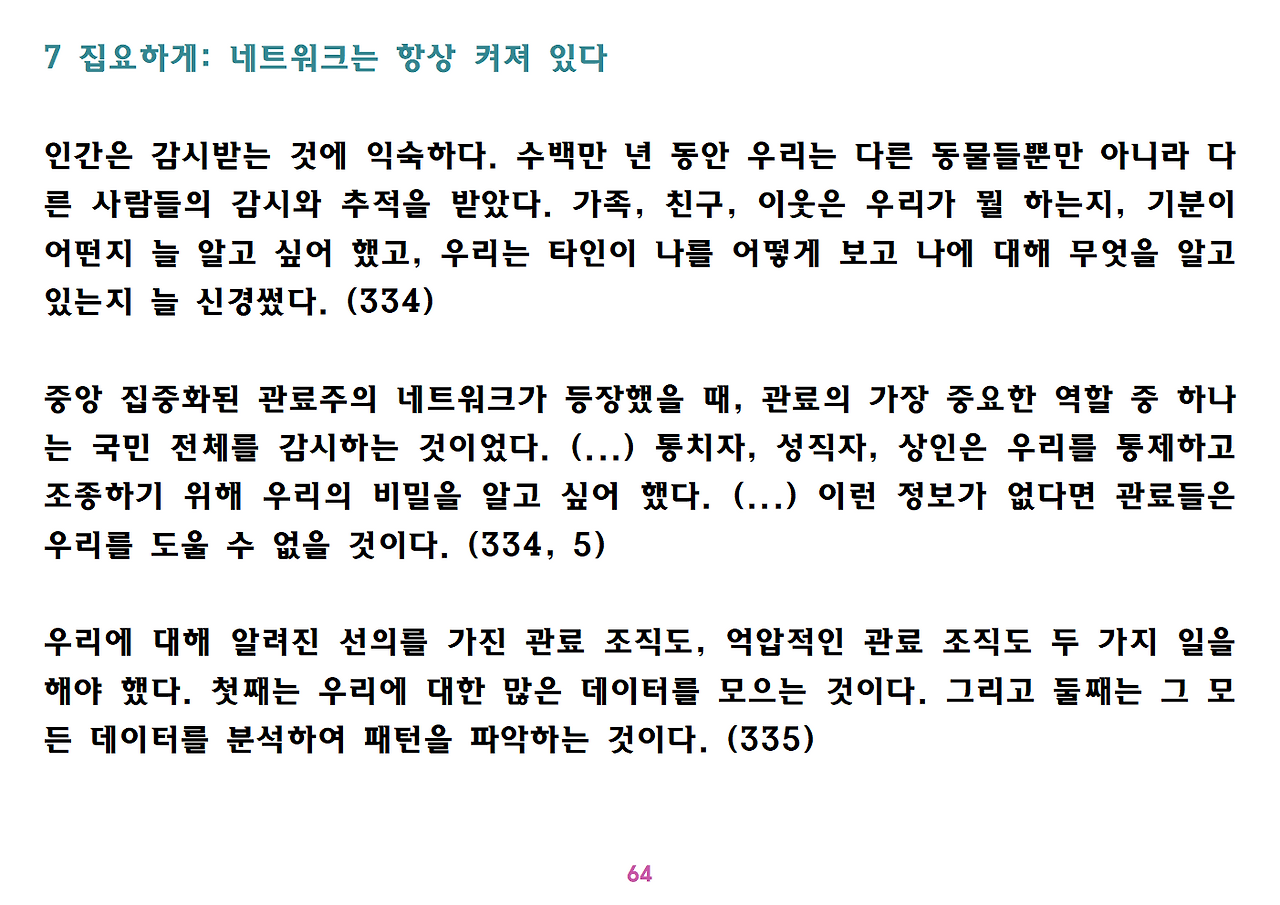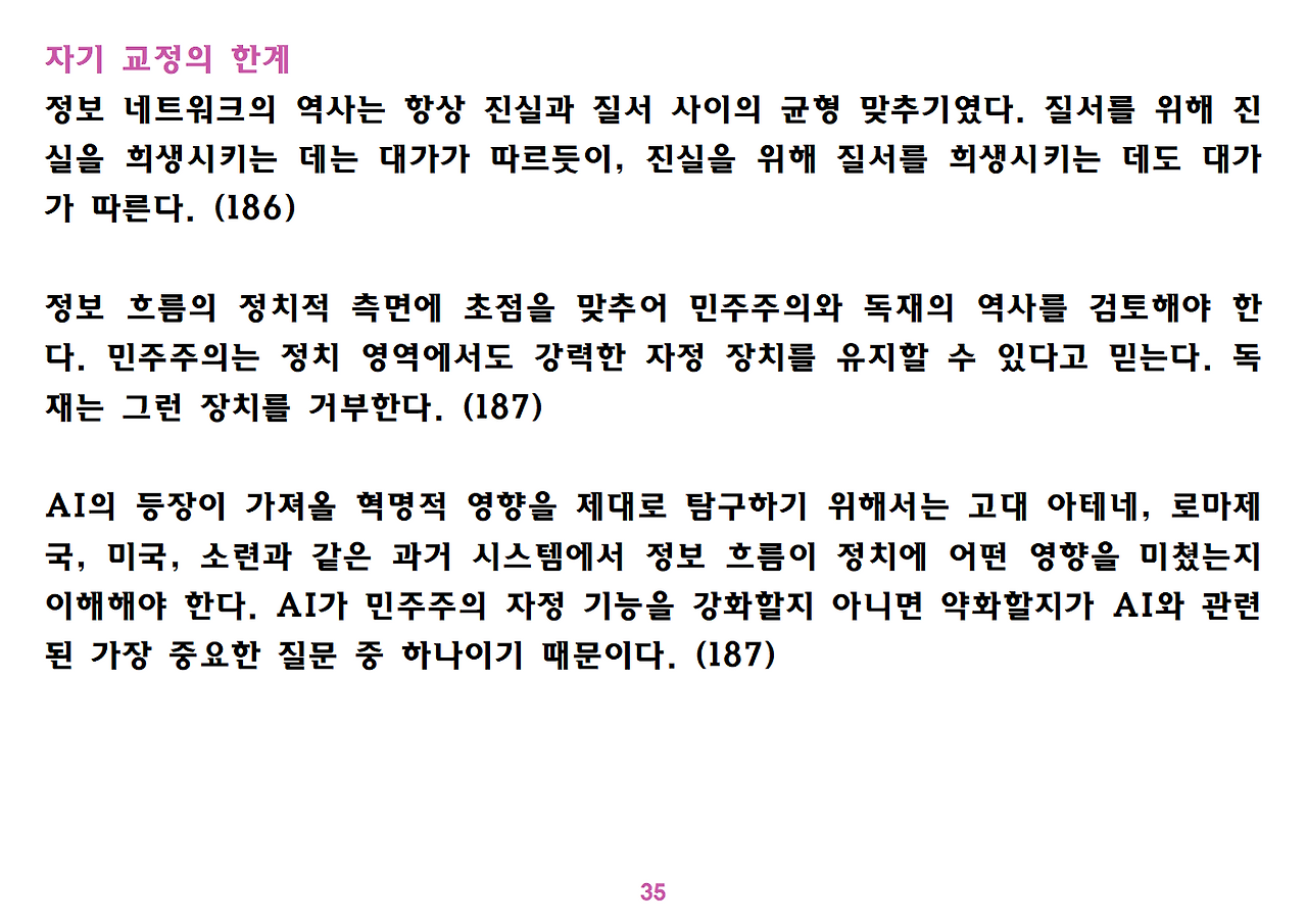 (독자가 지적해서 확인해보니) 유발 하라리의 인류학 3부작은 <사피엔스>, <호모 데우스>, <21세기를 위한 21가지 제언>이다. <사피엔스>에서는 인간(사피엔스)가 어떻게 지구의 최종 승자가 됐는지를 이야기했고, <호모 데우스>에서는 인간의 네트워크의 중심이 어떻게 신에서 인간으로, 인간에서 인터넷 데이터로 넘어갔는지. <21세기~>에서는 21세기를 살아가는 현대인이 어떤 문제에 봉착했으며 이를 어떻게 성찰해야 하는지 살폈다. <사피엔스> 이후 6년만에 <넥서스>가 나왔다. <넥서스>에서는 인간의 역사를 정보와 네트워크의 역사로 다시 조명하면서, 인간을 매개로 하지 않는 AI가 등장한 후 인간의 삶은 어떻게 바뀔지, 지구의 최종지배질서가 민주주의 혹은 전체주의가 될지, 아니면 AI가 될지를 살핀다. 그중에서 앞의 세 권의 책은 이미 발췌 정리하여 올렸고, 이제 마지막으로 <넥서스>를 올린다. (상업적 사용은 하지 마시길) 즐공!
