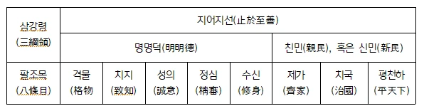 그렇다면 삼강령과 팔조목의 연관성은 어떤가? 가장 단순하게는 격물, 치지, 성의, 정심, 수신까지를 명명덕(明明德)에 해당하는 조목으로, 제가, 치국, 평천하를 신민(新民)에 해당하는 조목으로 채우면 된다. 아래 도표처럼.
