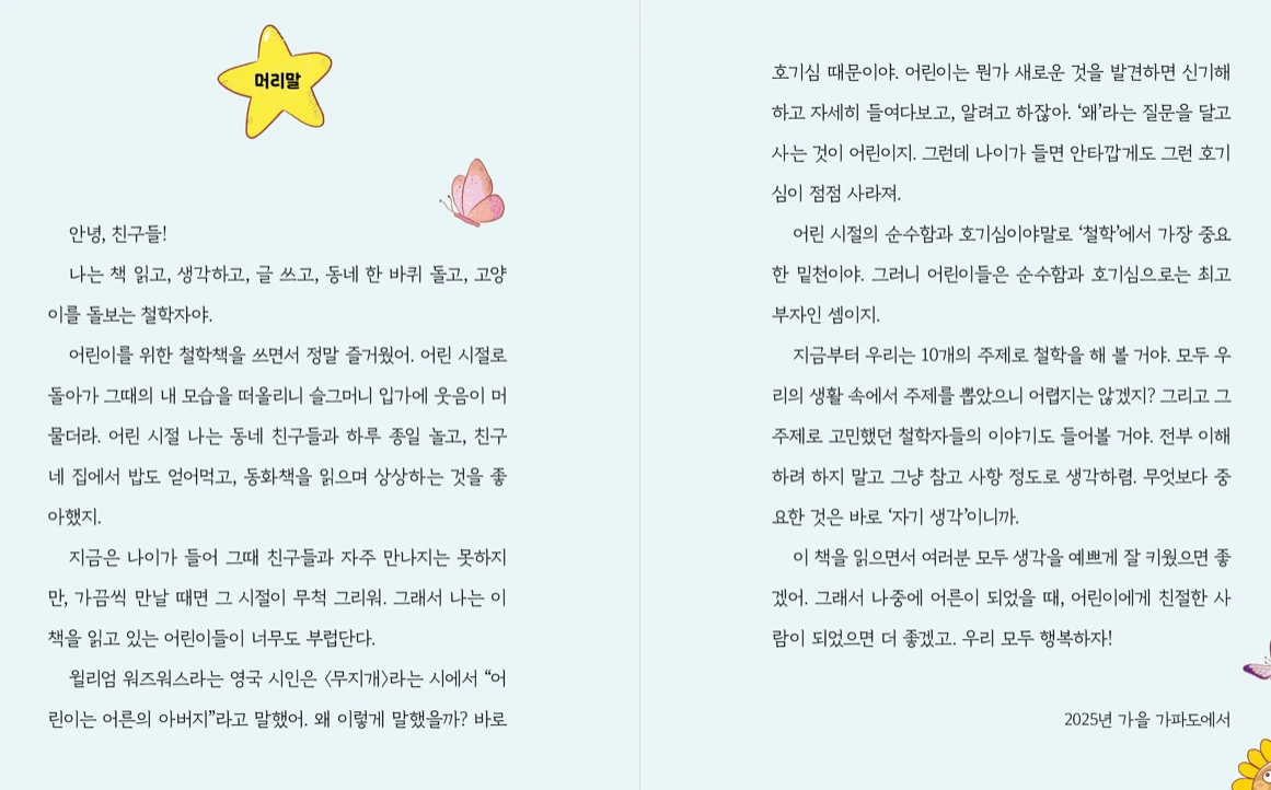 이 책은 내가 처음으로 쓰는 초등학생용 교양철학서다. 책을 좋아했던 어린 나에게 전하고픈 이야기를 담았다. 질문과 대답도, 소개해준 철학자도 어린 시절, 내가 알았으면 얼마나 좋았을까 생각하며 글을 썼다. 만화 콘티도 짰다. 어린 시절 나는 만화를 좋아했다. 책을 다 쓰고 서문을 썼다. 2024년 10월쯤 의뢰서를 받아서, 2025년 4월에 원고를 쓰기 시작해서 한 달 만에 원고를 완성했고, 9월 말에 책이 나왔다. 1년이 걸린 작업이었다. 다시 초등학생 때로 돌아가 나의 눈으로 읽어보니 좋다. 그럼 됐다. 아래에 책에 실어놓은 서문과 콘티를 만화로 그려놓은 작품을 옮긴다. 맛보기다.^^