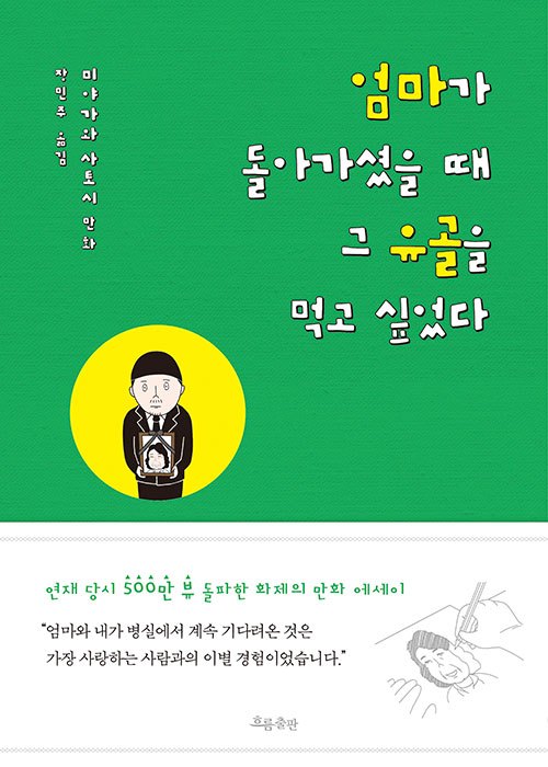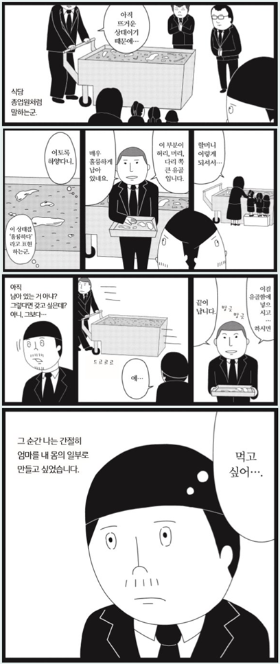 《엄마가 돌아가셨을 때 그 유골을 먹고 싶었다》(흐름출판, 2020)를 읽어보라고 추천받았을 때, 속으로 ‘엽기적인데’라고 생각했다. 하지만 식인욕망은 엽기적이라고 단정지을 수 없는 만큼 여러 지층을 형성하고 있는 문화적 현상이어서 도대체 어떤 책일까 궁금하기도 했다. 그리고 드디어 추천작가가 건낸 책을 읽어보고 나서 엽기가 아니라 감동 만화에세이였다.