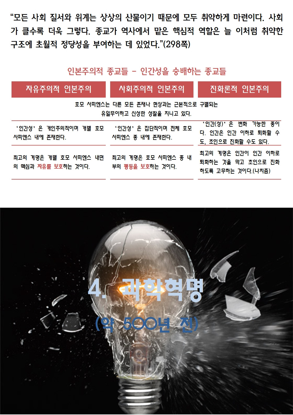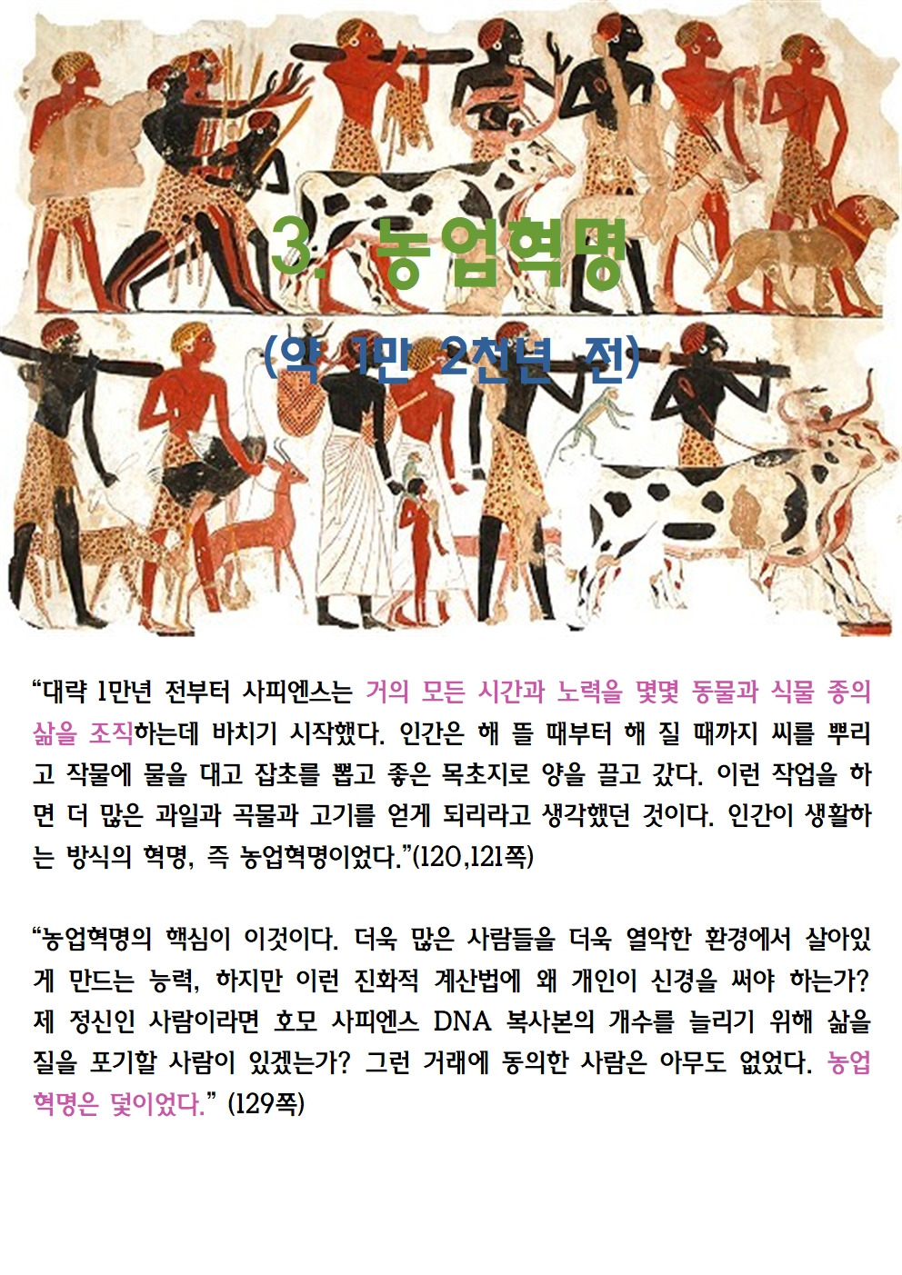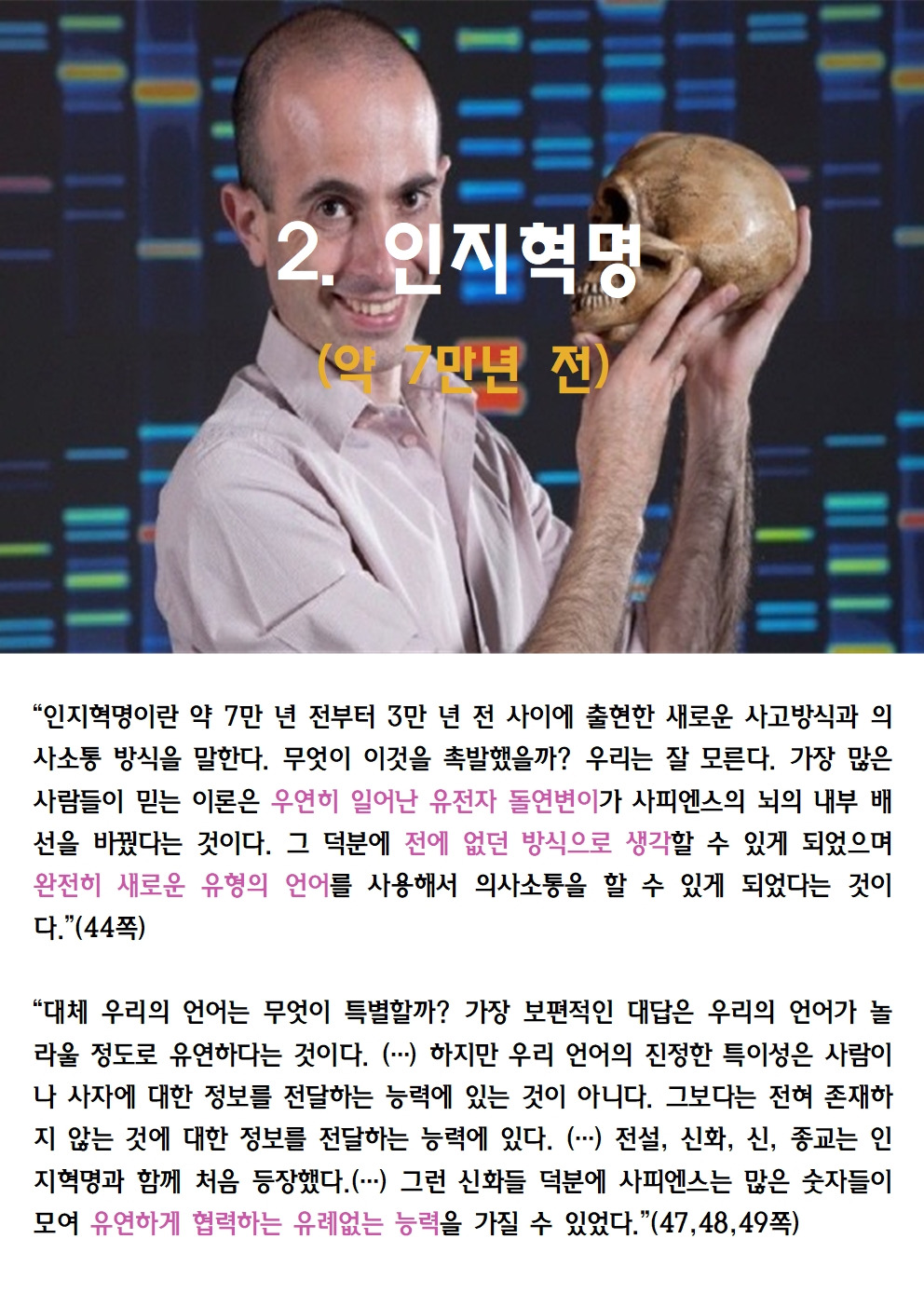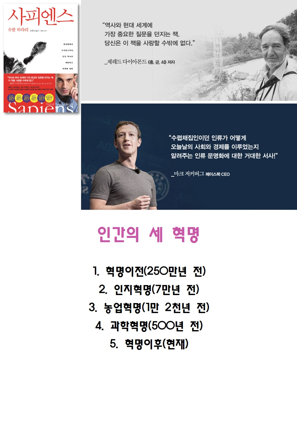 2015년 유발 하라리가 쓴 사피엔스는 빅히스토리 역사에서 세계 최고의 베스트셀러였다. 유발 하라리는 이스라엘 대학에서 중세전쟁사를 전공한 일개 학자에 불과했지만, 이 책 하나로 전세계적 학자가 되었다. 이 책을 계기로 전세계의 모든 매체에 등장하며 자신의 선견지명(?)과 독특한 관점을 재미난 논거를 들이밀며 설명하였다. 유발 하라리는 이후에도 2017년 <호모 데우스>와 2018년 <21세기를 위한 21가지 제언>을 쓰며 빅히스토리 3부작을 완성했다. 세 번째 책의 정리본을 올렸더니 많은 분들이 호응해주셨다. 이번에는 첫번째 책의 정리본을 올린다. <사피엔스>가 나왔을 때 정리하여 이곳저곳 강의하며 다녔다. 그 강의 ppt본이다. 도움이 되었으면 좋겠다.