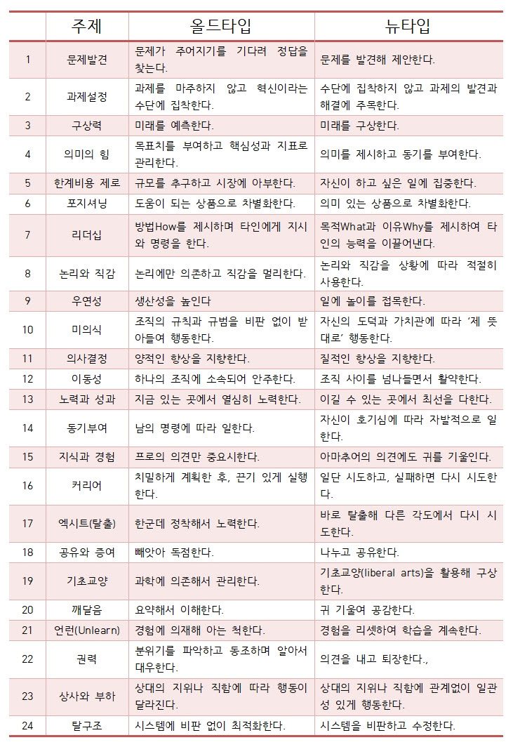 이를 더 간략히 말해보자면, 올드타입은 문제보다는 정답을 찾고, 미래를 예측하는데 시간을 낭비하며, 규정에 따르고, 협소한 경험에 의지해서 삶을 살고 기업이나 조직을 운영하는 것이다. 이에 반해 뉴타입은 답보다는 문제를 발견하고, 미래를 예측하기보다 구상하고, 규정보다는 자신의 철학을 따르며, 이전이 경험이나 지식에 고착되지 않고 이를 리셋할 수 있도록 살아가는 것이다.