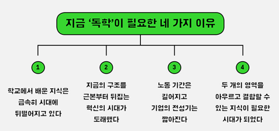 내가 관심을 두는 부분은 ‘독학의 기술’ 부분이다. 사실 중년 이후의 대부분의 배움은 독학이다. 성인이 된 사람들은 대개가 독학을 중심으로 나머지를 보완하고 있다. 그런데 그 독학의 효용성은 천차만별이다. 저자 역시 철학(인문학)을 전공한 사람인데, 저자가 활동하고 있는 부분은 경제경영 컨설턴트이니 실제로 활동하는 분야는 독학으로 해결한 셈이다. 지은이는 그런 점에서 크로스오버에 능통한 지식인이다. 지은이는 독학이 필요한 이유를 4가지로 설명한다.(도표 참조) 크로스오버는 여기서 4번째에 해당한다.