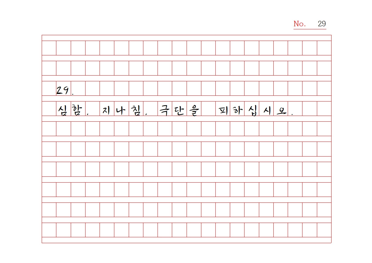 노자 29장의 풀어서 쓰면 이렇습니다. “만일 천하를 억지로 얻고자 한다면 그것이 불가능하다는 것을 나는 아오. 천하는 신묘한 것이어서 억지로 얻을 수 있는 것이 아니오. 억지로 얻고자하면 실패하고, 억지로 잡고자 하면 잃게 되지요. 세상만사 마찬가지. 앞서는가 하면 뒤처지고, 약한가 하면 강해지고, 일어서는가 하면 무너집니다. 그러니 어찌해야겠습니까? 심함, 지나침, 극단을 피해야 합니다.”