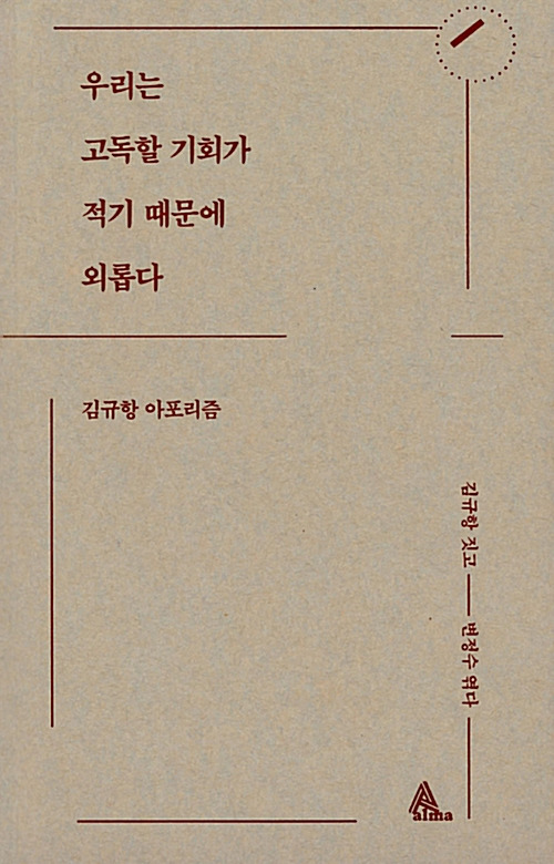 김규항은 《B급 좌파》와 《예수전》을 썼고, 어린이 교양지 《고래가 그랬어》의 발행인이다. 그의 글을 페북에서 볼 때마다 이 작가는 아포리즘에 능하구나 생각했다. 아니나 다를까. 평론가와 편집자로 일하는 변정수가 그의 글 중 압축적이고 명상할 만한 글을 선별하여 시원시원한 책으로 엮었다. 책 제목은 《우리는 고독할 기회가 적기 때문에 외롭다》(알마, 2019)이다.