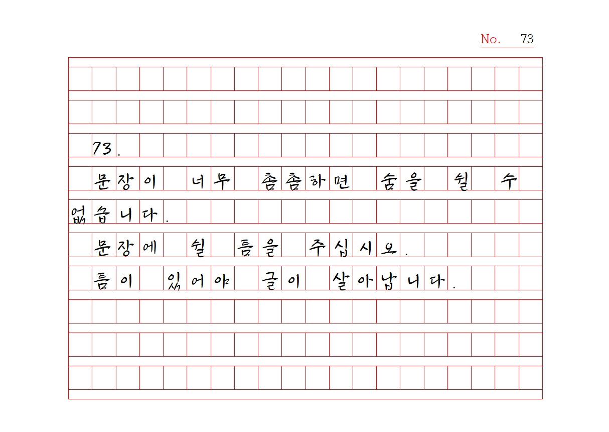 글쓰기도 마찬가지. 문장과 문장 사이에, 문단과 문단 사이에 간격이 중요합니다. 눈에 보이는 물리적 간격을 말하는 것이 아닙니다. (물론 띄어쓰기, 문단 나누기를 해야겠지요.) 글을 읽는 독자의 심리적 간격을 염두에 두고 글을 써야 합니다. 달리 말하면 문장 사이에 틈을 두어야 합니다. 독자들이 문장을 이해하고 음미하고 느낄 수 있도록 문장의 속도와 간격을 조정해야 합니다. 이를 문장의 호흡법이라 말해보면, 문장들도 숨쉴 수 있는 틈을 주어야 생명이 유지됩니다. 문장에 쉴 틈을 주십시오. 틈이 있어야 글이 살아납니다.