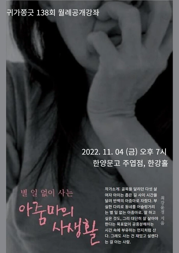 그 맴버 중 한 명인 최강윤정님이 최근에 POD방식으로 사진에세이집을 냈습니다. 제목은 《별 일 없이 사는 아줌마의 사생활》입니다. 책을 펼치지 안쪽 날개에 작가소개가 재밌습니다. “골목을 달리던 다섯 살 여자 아이는 좁은 길 사이 시간을 달려 반백의 아줌마로 자랐다. 부실한 다리로 동네를 어슬렁거리는 별 일 없는 아줌마로, 잘 하고 싶은 것도, 그리 대단히 잘 살아야 한다는 목표없이 공중분해하는 시간 속에 부유하는 먼지처럼 산다. 그래도 사는 건 재밌고 설렌다는 걸 아는 사람.”