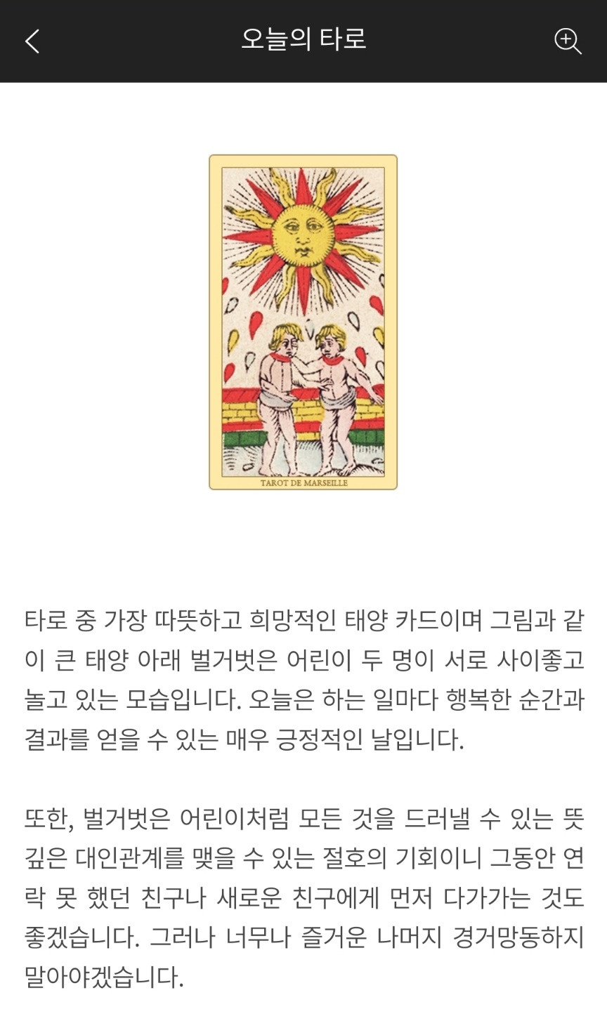 계묘년(癸卯年) 새해입니다. 사람들은 새해가 되면 누구나 아직 이루지 못한 소망 하나쯤은 품고 살아가게 됩니다. 어떤 사람들은 재미로, 혹은 습관처럼 점을 치기도 합니다. 저도 재미 삼아 하루운세를 타로점으로 봐봤습니다. 태양 카드가 나왔는데요. 태양 아래 벌거벗은 두 아이가 사이좋게 놀고 있는 모습입니다. 하는 일마다 행복하고 즐거운 결과를 얻을 수 있는 매우 긍정적인 날이라고 점괘가 나왔습니다. 하지만 마지막 문장에는 “그러나 너무 즐거운 나머지 경거망동하지 말아야겠습니다.”라는 경고문으로 기운을 살짝 눌러주네요.