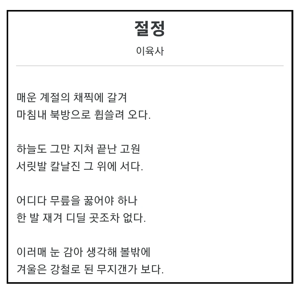 엄혹한 일제시대 저항시인 이육사는 절망의 끄트머리에 <절정>이란 시를 썼다.