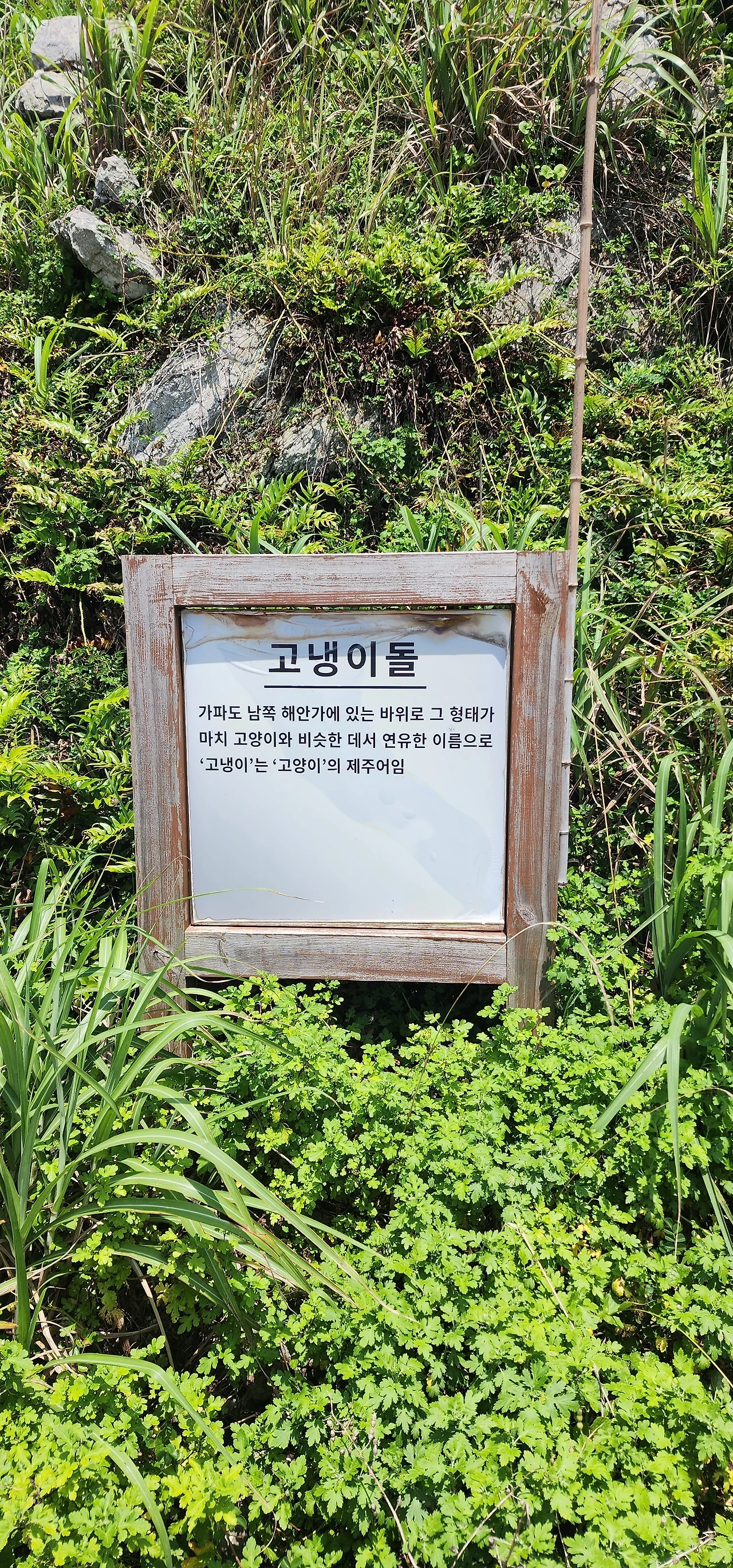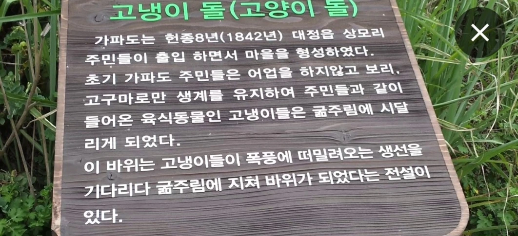 이 표지판은 인터넷에서 검색하다가 찾은 것이다. 현재는 역사성과 서사성이 없는 밋밋한 문구가 써있다.(아래 사진) 가파도에 주민들이 이주해와 살기 시작할 때 고양이도 따라와 살기 시작했는데, 주민들이 처음에는 고기를 잡지 못하고, 보리와 고구마만으로 연명하자 굶주림에 시달리던 고양이들이 바닷가로 와서 태풍에 밀려오는 물고기를 기다리다가 바위가 되었다는 이야기는 뭔가 서글프고 고달프고 아련한 정서를 자극한다. 현재의 집고양이들은 굶주리지는 않지만, 물고기가 아니라 사료를 먹는다. (배고프지는 않겠지만 맛있는지는 알 수 없다.)