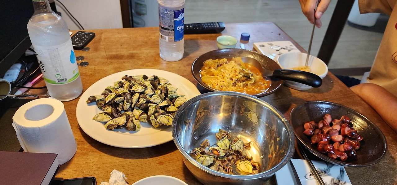 넷째날 야식 : 김치찌개, 삶은 거북손, 프랑크 소시지, 한라산 소주 1병 (손님 초대 실패)