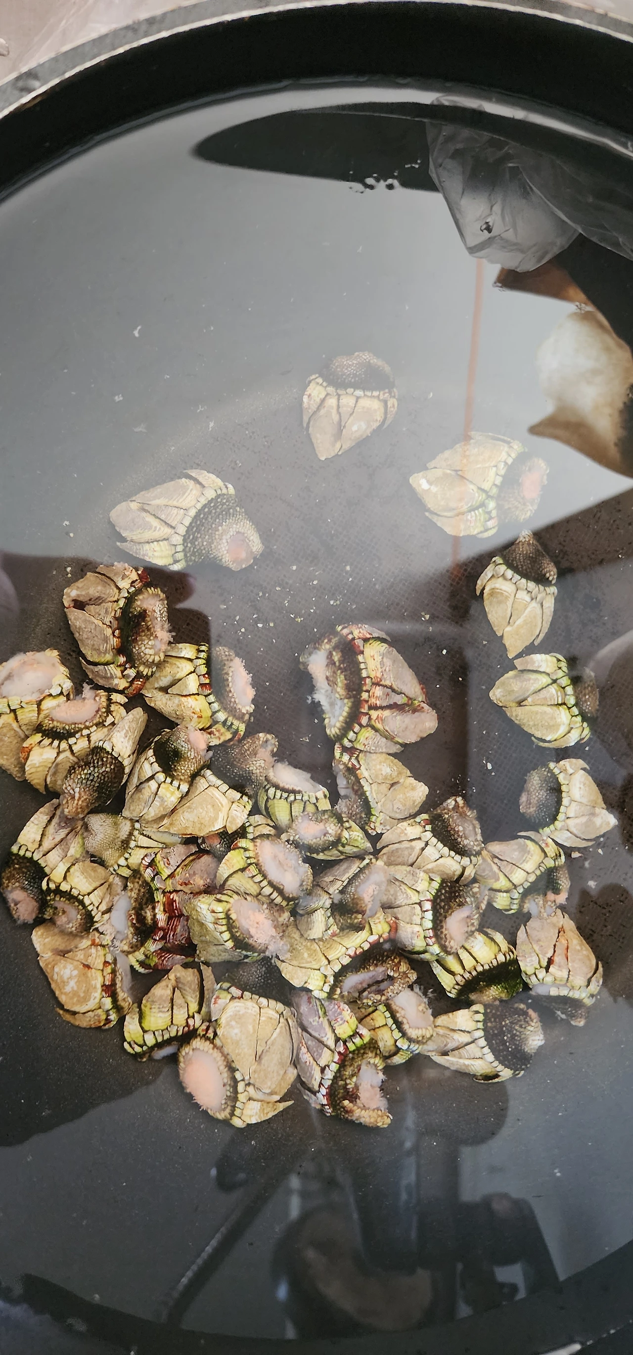 바닷가 바위에 붙어있는 거북손을 긴 낫으로 체취하여 물에 잘 씻은 후 삶아 먹어 봤는데 공들인 노력에 비해 맛은 별로였다.