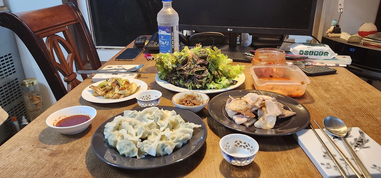 들째날 저녁 : 삼겹살 구이, 물만두, 한라산 소주 1병