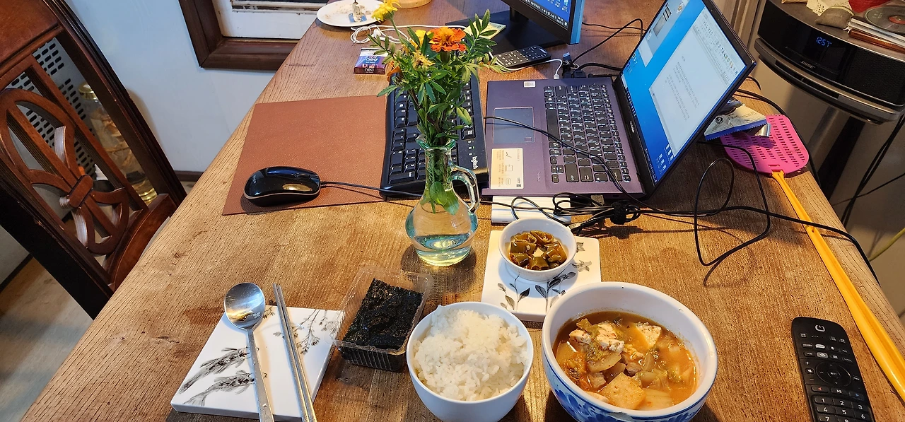 평상시 나라면 이중에 단 하나도 지키지 않았을 것이다. 이제 친구 없이 홀로 지내니 이 네 가지를 지킬 수 있을지 자신은 없다. 그래도 이 중에 1)번과 3)번은 꼭 지켜보고 싶다. 특히 3)번은 자신을 사랑하고 존중하는 멋진 일이라고 생각한다. 오늘은 세 끼를 꼬박 챙겨 먹었는데 규모와 음식의 특성을 생각하며 차려 먹었다. (심지어 저녁은 꽃병까지 세워 분위기를 잡았다. 친구보다 더 진화한 것인가?)