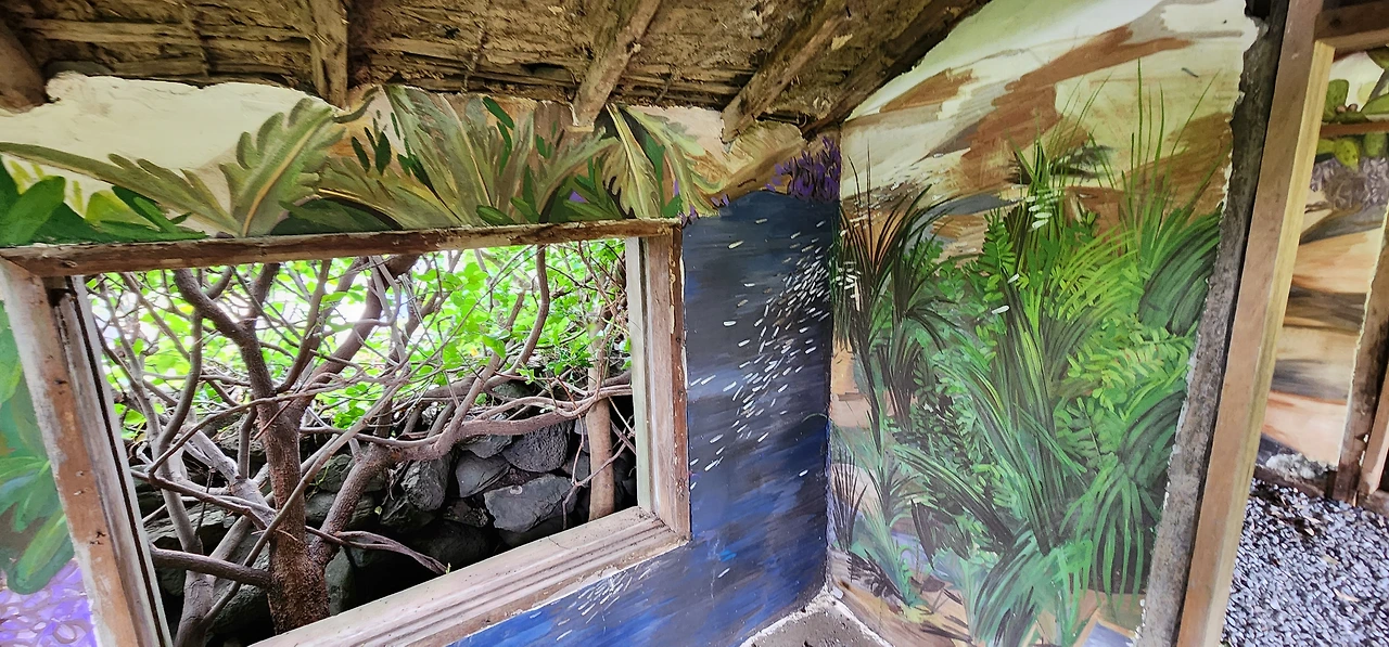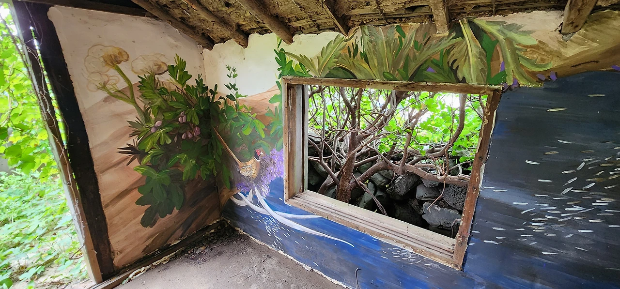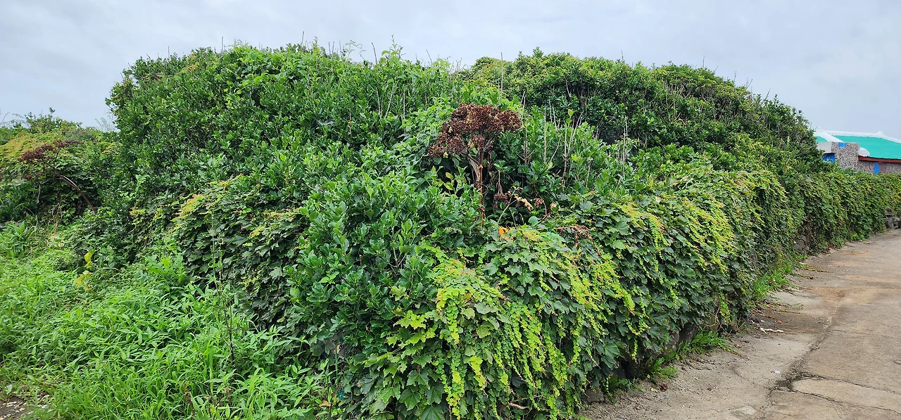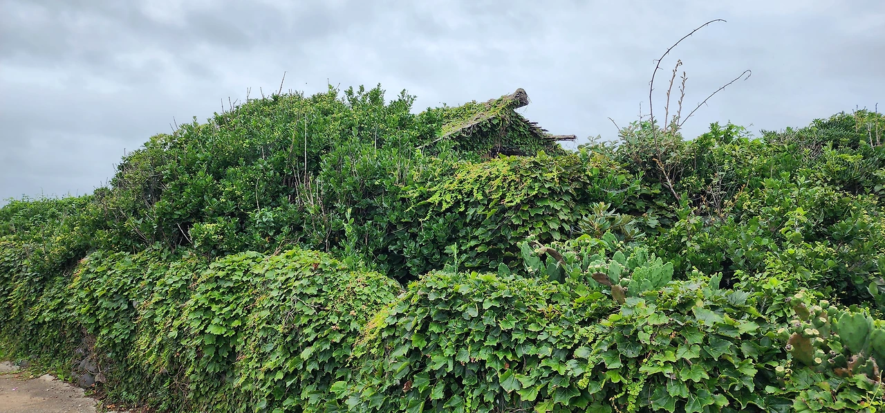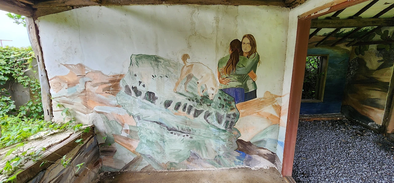 가파도에 오시면 매표소 바로 뒷쪽에 위치한 커피전문점과 중국음식점을 바로 발견할 수 있다. 두 곳 다 맛집으로 유명하다. 식사와 후식 사이 잠깐 짬을 내어 찾아간 곳이 폐허가 된 프레스코(벽화)가 그려진 폐가였다. 여기서 잠깐 설명이 필요한데 폐가는 사람이 더 이상 살지 않는 집이고, 폐허는 아예 더 망가져 살 수 없게 된 곳이다. 사람이 살지 않는 폐가라도 잘 수리하고 관리하면 명소가 될 수 있고, 심지어는 사람들이 거주할 수 있는 집으로 개조하여 더 잘 이용할 수 있다. 내가 방문한 곳은 제주비엔날레 행사 때 초청받은 작가가 가파도에 있는 아티스트 인 레지던스에 머물면서 작업하고 출품한 명소(?)였다. 그러나 행사가 끝나고 아무도 관리하지 않고 방치하여 지금은 밖에서는 집인지조차 구별할 수 없는 곳이 되었고, 안으로 들어가려 해도 풀들과 벌레들로 쉽게 발길이 닿지 않는 곳이 되고 말았다.