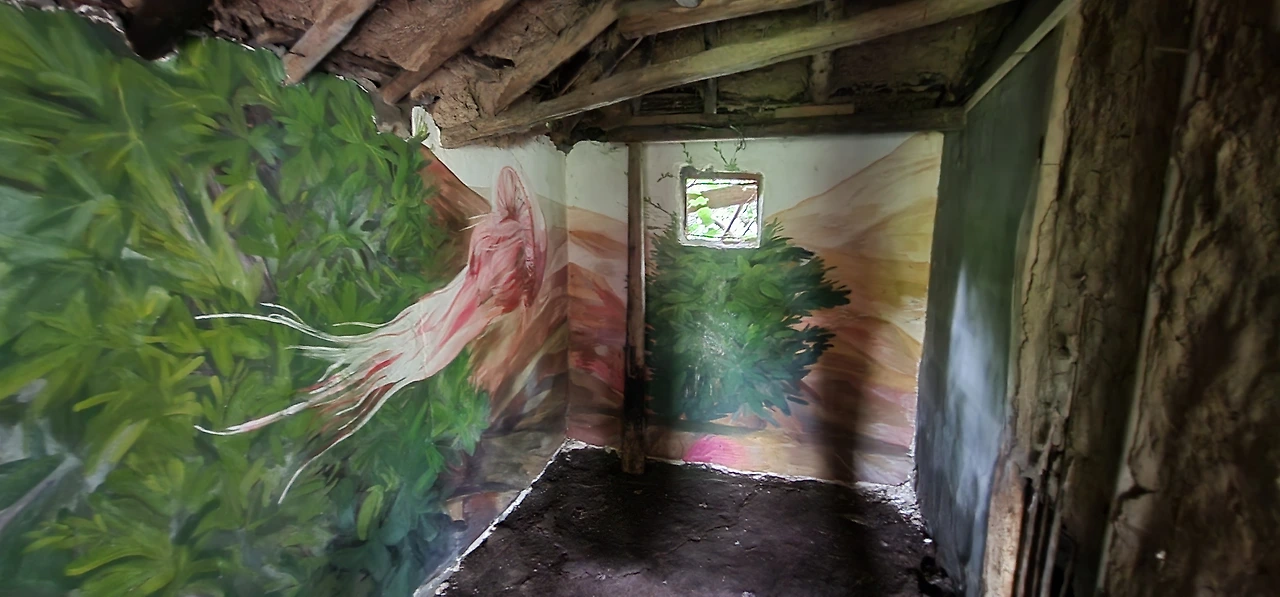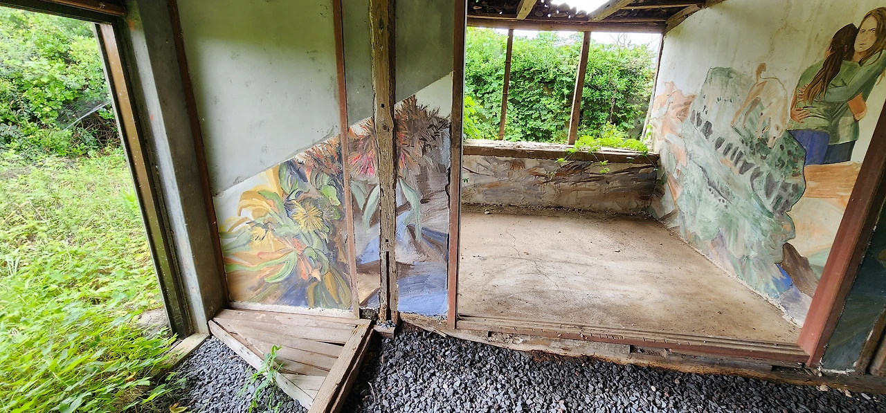 하지만 용기를 내어 들어가 보기로 했다. (풀과 벌레 따위를 무서워할 내가 아니다.) 풀들을 헤치고 들어가 보니 마당에도 풀이 무성하지만 이곳이 프레스코 작업을 한 예술적 장소임을 확연히 알 수 있었다. 집도 폐가가 되기 전에는 꽤나 운치 있는 사람이 거주했을 법한 근사한 창틀과 가운데를 마루 대신 돌로 구성하고 좌우 양쪽으로 방 2개씩을 내어놓은 독특한 구조를 띤 집이었다.