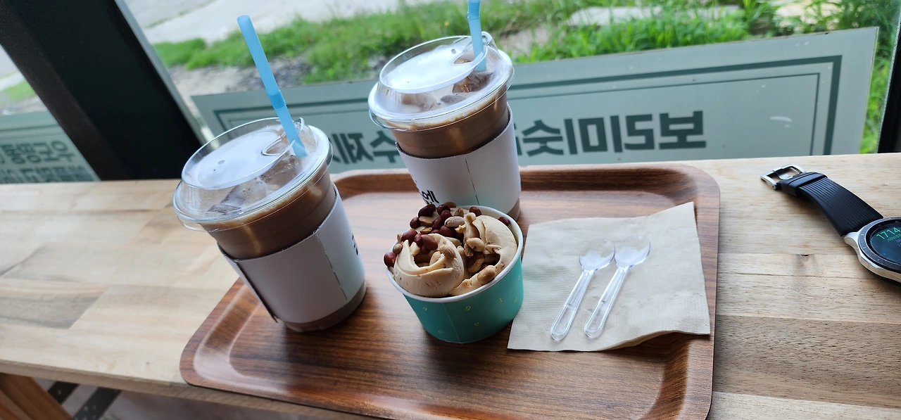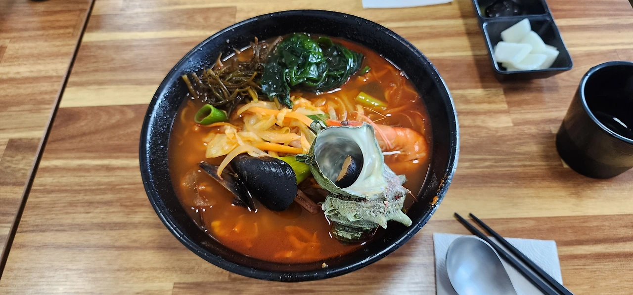 식사는 매표소 가까운 곳에 위치한 중국집에서 해물짬뽕을 대접받았다. 나는 후식으로 가파도 청보리 미숫가루 주스와 우도 땅콩으로 토핑한 아이스크림을 대접했다. (가게 안에 청보리밭 일출 사진이 인상적이다.)
