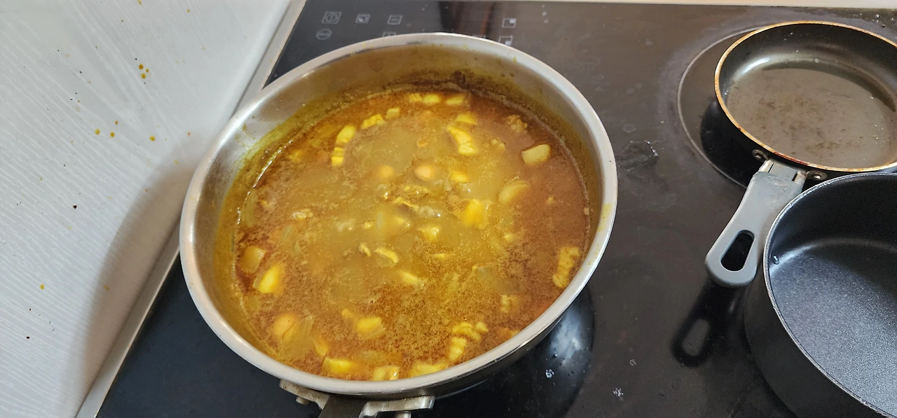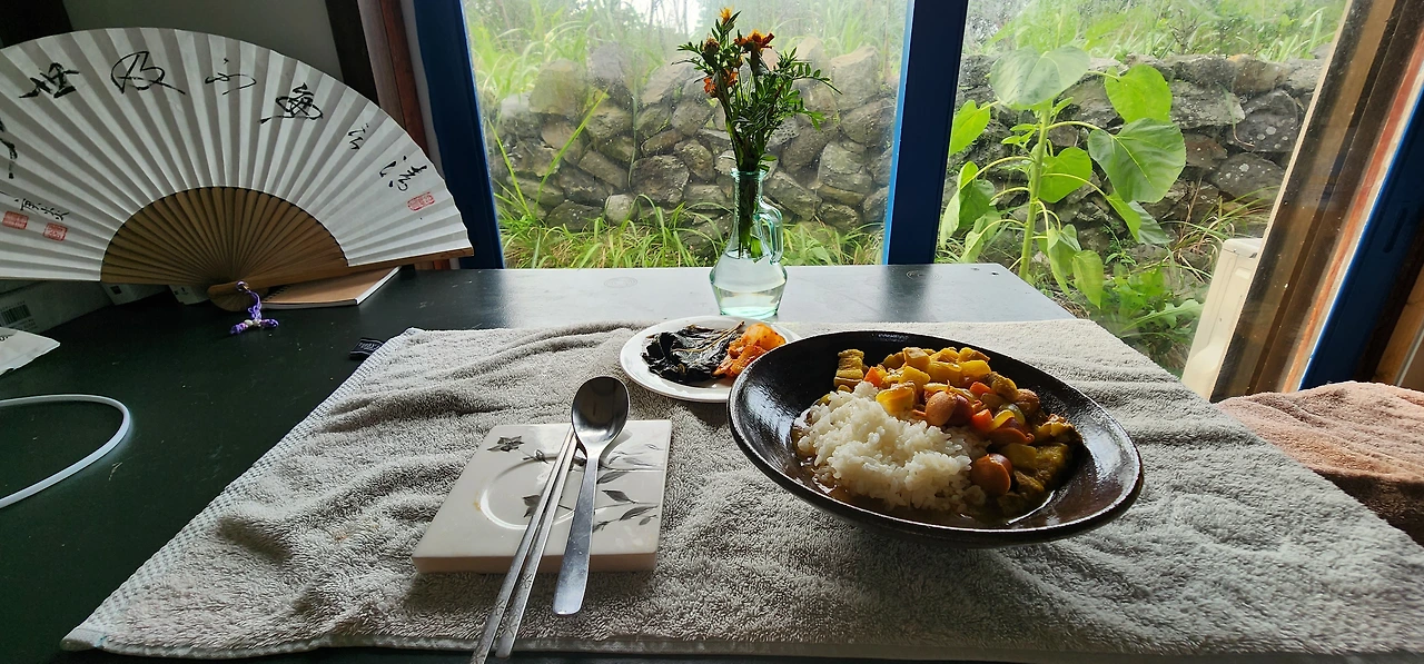 간단히 집 앞을 산책하고 돌아오니 배가 출출하다. 밥도 다 되었다. 카레를 다시 끓여 농도를 높이고 나서 밥 위에 카레를 얹어 잘 비벼서 반찬과 먹으면 소박하지만 든든한 저녁식사 거리다.