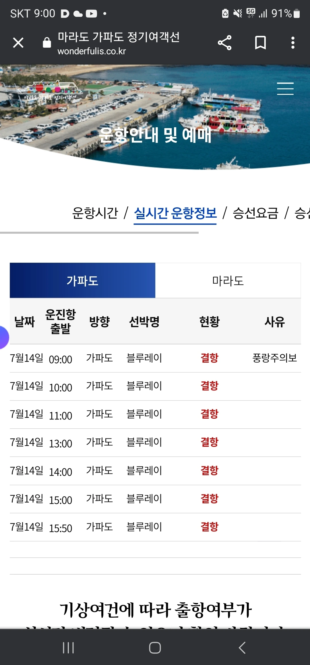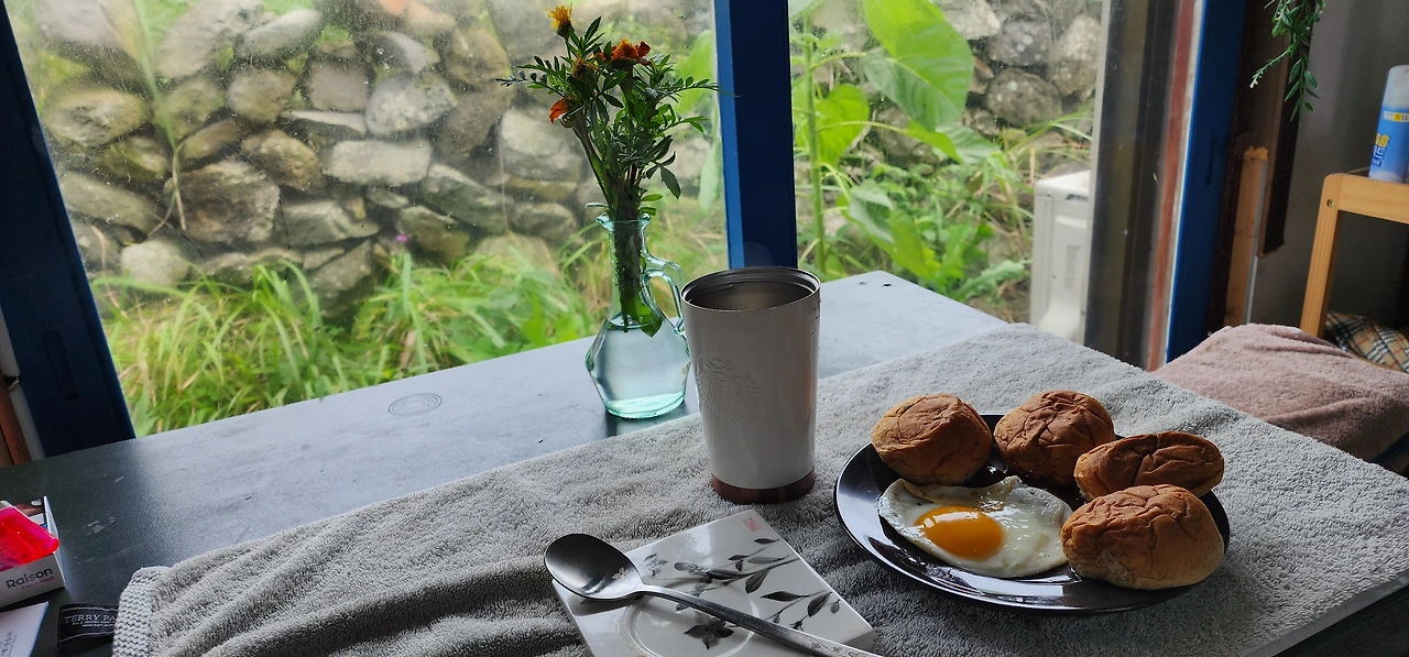 9시에 아침식사로 모닝빵을 굽고, 계란프라이를 하고, 어제 만들어 냉장한 차를 준비한다. (커피만 마셨던 내가 아침에 차를 마시는 것도 처음 있는 일이다.) 아참, 9시에 가파도 배편의 실시간 운항 정보를 확인한다. 가파도 주민이라면 누구나 하루 시작은 배가 뜨느냐 마느냐를 확인하는 것이다. 오늘 풍랑주의보가 떠서 전체 배편이 결항이다. (즉, 여행객을 받는 가파도 주민들은 오늘 공친 날이란 뜻이다.) 아무도 나가지도 들어오지도 못한다. (오늘 하루는 섬이 조용하겠구나.)