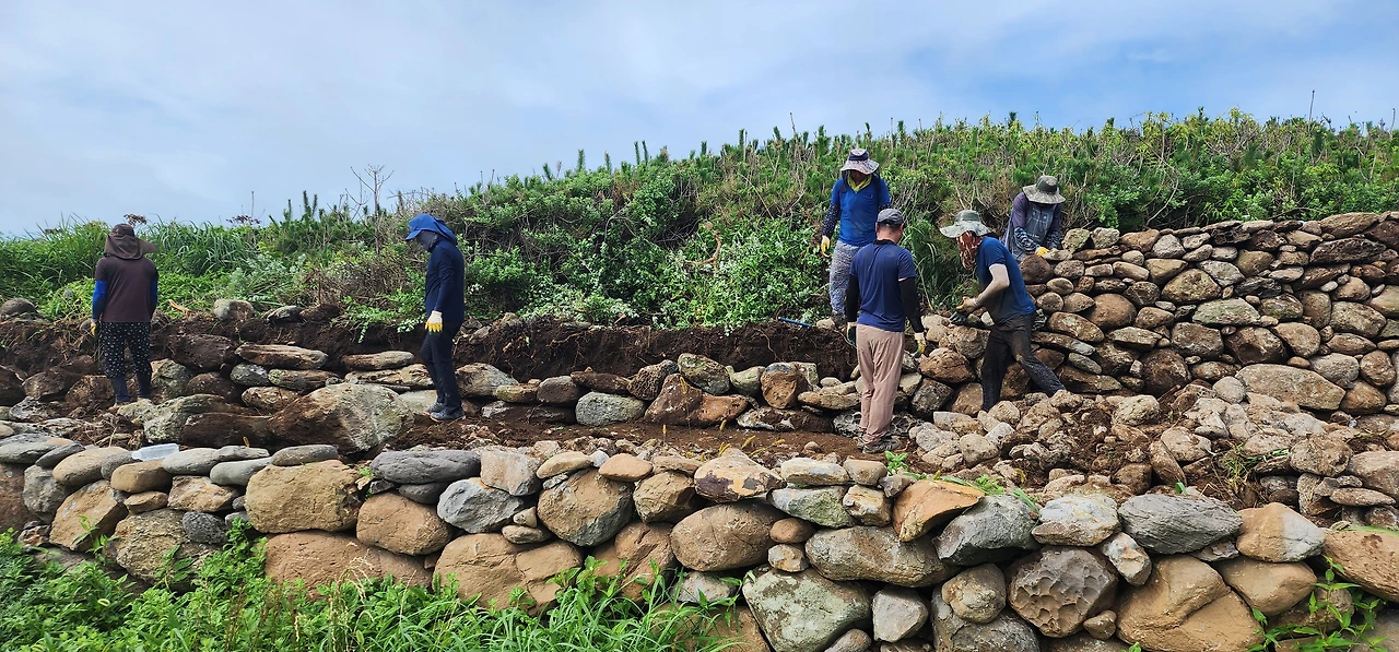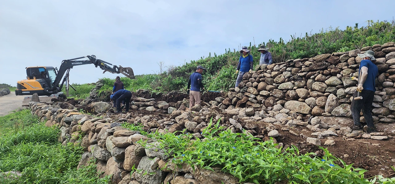 이제 다시 반대쪽으로 돌자. 해지면 아름다운 풍경이 그려진다는 해안가에서 포클레인으로 돌담을 무너뜨리고, 무너진 돌덩이로 다시 담을 만드는 일군의 일꾼들을 만난다. (지난번 매표소 직원이 알려준 제주도 전통 돌담을 연구하여 보존, 복원한다는 회원분들이 틀림없다.) 자전거에서 내려 인사하고 나를 소개한다.